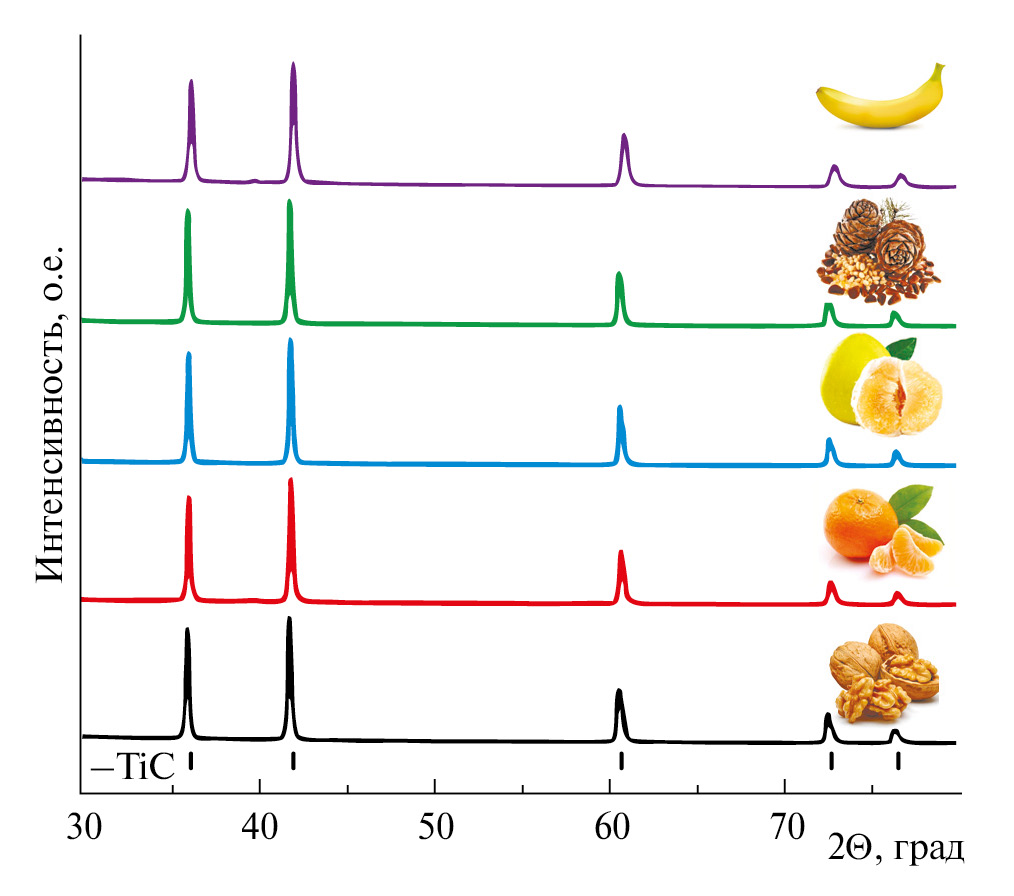 Термическая конверсия биомассы привела к существенному росту теплоты сгорания практически для всех образцов кроме образца банановой кожуры. Углерод, полученный из отходов пищевой промышленности после термической конверсии, становится более энергетически пригодным продуктом, но в нашем случае мы его рассматриваем в качестве компоненты к исходному порошку для формирования карбида титана.
