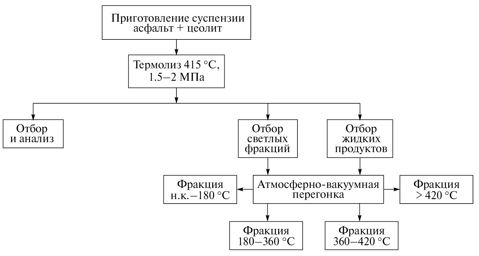 На основании полученных данных предлагается блок-схема процесса термолиза асфальта деасфальтизации в присутствии природных цеолитов, приведенная на рис. 2.