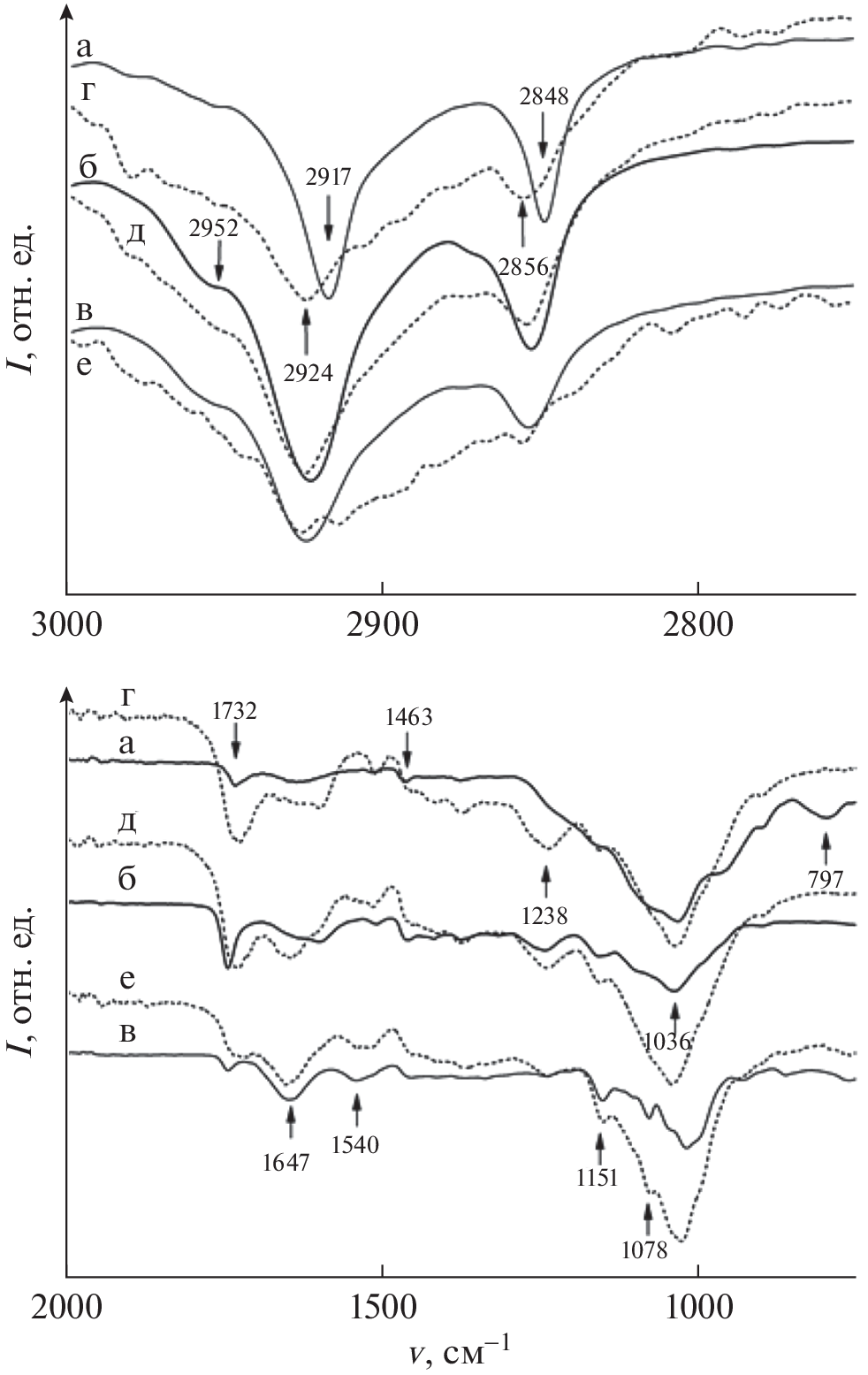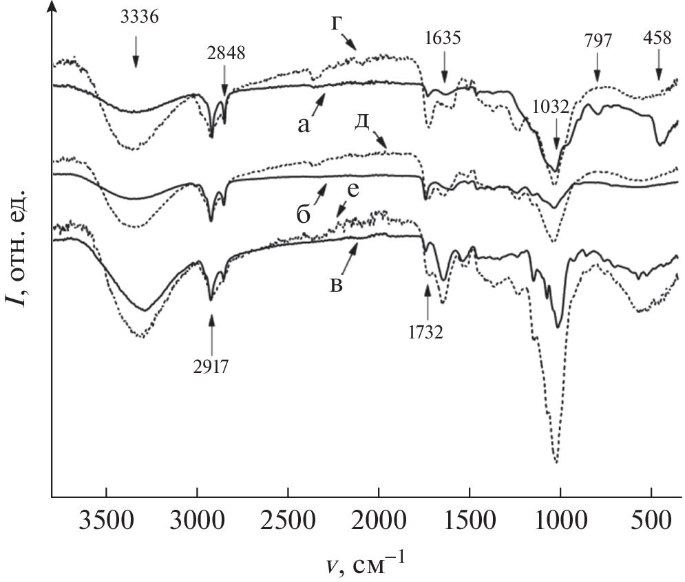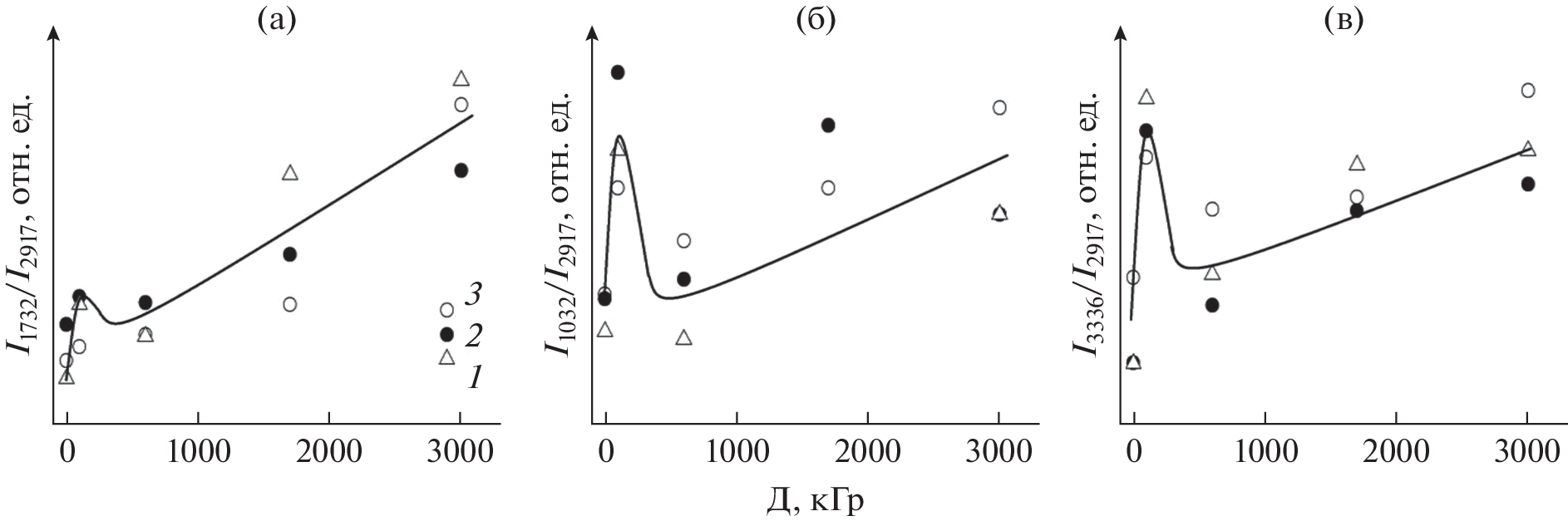 Исследовано влияние дозы γ-облучения на состав функциональных групп на поверхности цветочной пленки, зерновика и порошка семян овса. В результате радиолиза повышается относительная интенсивность полос поглощения, связанная с колебаниями C=O, C–O–C и O–H-связей, появляются полосы поглощения ненасыщенных связей. При этом в спектре облучeнного овса сохраняются свойственные зерну овса полосы поглощения в ИК области. Следовательно, воздействие γ-излучения дозой до 3000 кГр не приводит к полному разрушению химических связей в структуре соединений, содержащихся в семян овса. Структуры зерновика, пленки и целого зерна овса при относительно малых дозах облучения (до 600 кГр) остаются визуально не поврежденными. Однако при более высоких дозах облучения (1700–3000 кГр) зерна овса теряют первичную твердость и пленчатость, нарушается сплошность поверхности зерновика и целых зерен. Следует отметить, что первоначальный соломенно-желтый цвет ЦЗ овса в ходе радиолиза постепенно меняется сначала на светло- коричневый, а затем на тeмно-коричневый с повышением дозы облучения в результате накопления в структуре полимера различных хромофорных групп (C=C, C=O), а также ауксохромной группы OH, вызывающей более глубокую интенсивность цвета, усиливая действия хромофорных групп. Изменения цвета зерен овса с повышением дозы γ-облучения овса указывает на радиационную карбонизацию и окисления макромолекул зерен.