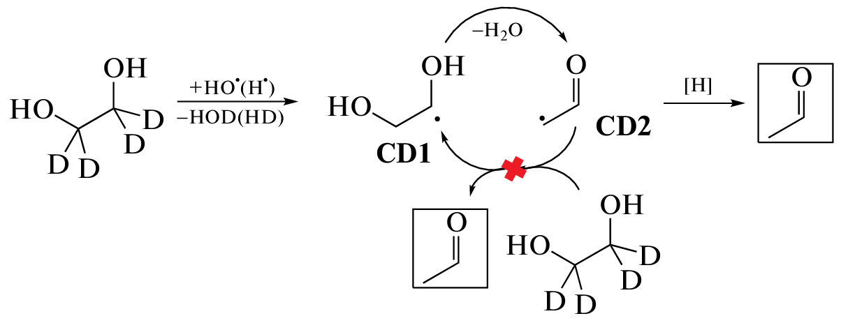 This study is devoted to the effect of complete deuteration of the ethylene glycol carbon skeleton on the formation of its radiation-induced free-radical transformations products in deaerated aqueous solutions at pH 7.00 ± 0.10 and a dose rate of 0.064 ± 0.002 Gy/s. It has been established that the chain process of fragmentation of carbon-centered ethylene glycol radicals (∙CH(OH)CH2OH) plays an important role in the formation of acetaldehyde. The replacement of protium atoms located at carbon atoms by deuterium decreased the radiation-chemical yield of acetaldehyde in aqueous 1 M solutions of diols by a factor of 8. The results of this study indicate that the use of deuterium exchange at the carbon skeleton of organic molecules is a promising way for increasing their resistance to radiation-induced free radical fragmentation processes.