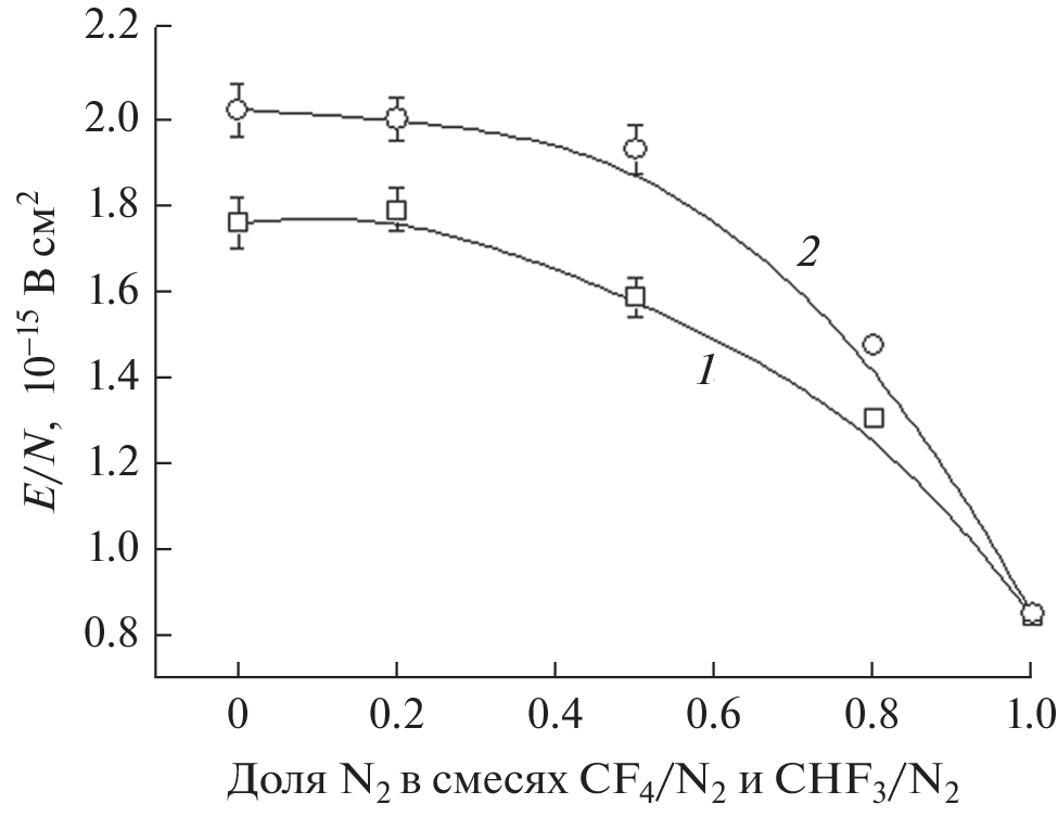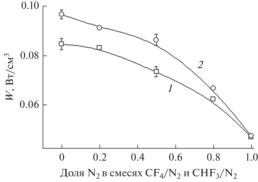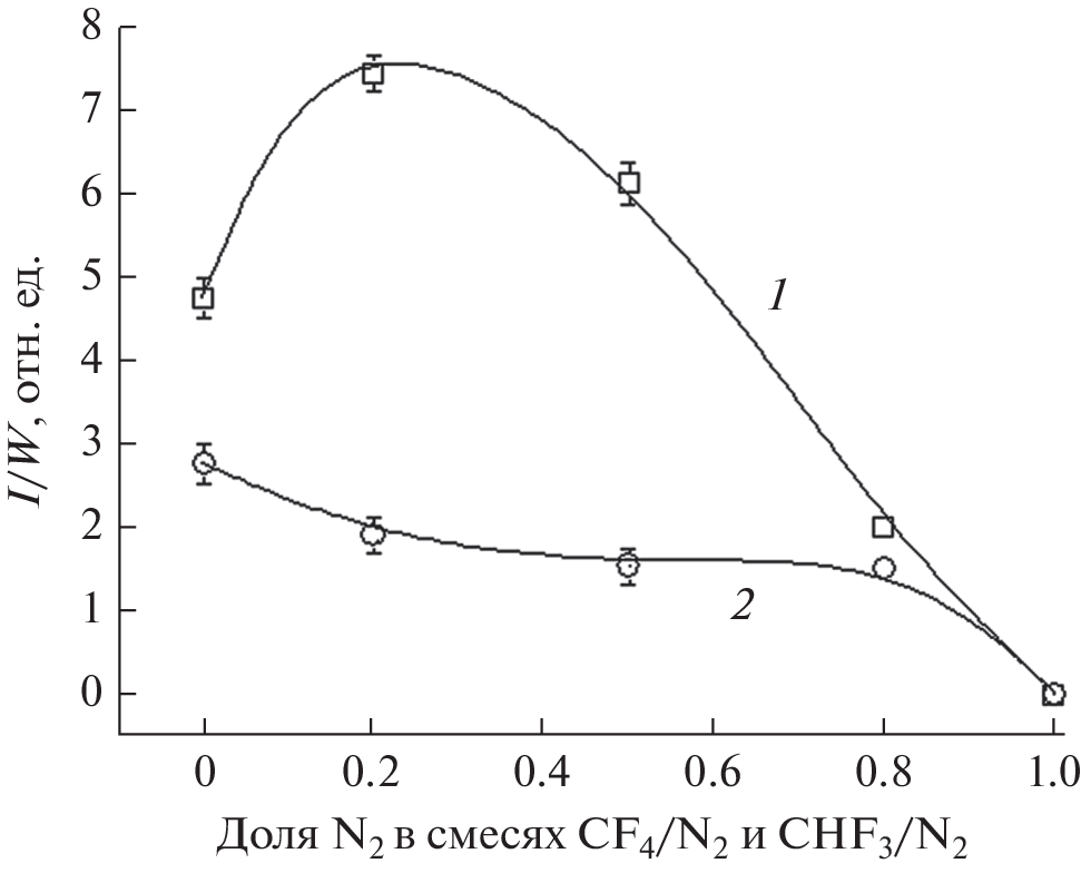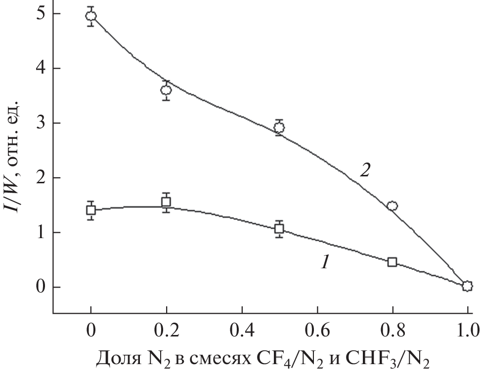 The influence of the mixture composition on the electrophysical parameters and plasma emission spectra of mixtures of tetrafluoromethane and trifluoromethane with nitrogen under dc glow discharge conditions has been analyzed. It has been established that the reduced electric field strength changes nonlinearly with an increase in the proportion of the second gas in both mixtures. The reduced intensity of atomic fluorine emission in the CF4/N2 mixture is shown to pass through a maximum at a nitrogen volume fraction of 0.2, whereas a monotonic change in this dependence is observed for the CHF3/N2 mixture. The reduced emission intensities of CF2 radicals decrease monotonically with an increase in the nitrogen fraction in both mixtures.