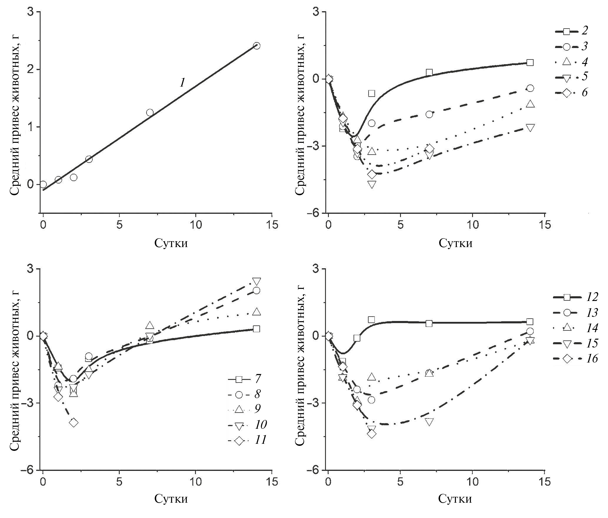 Рис. 2. Изменение массы тела мышей в ходе контрольного эксперимента (1) и при изучении острой токсичности необлученного (2, 3, 4, 5, 6) и облученного дозой 500 (7, 8, 9, 10, 11) и 1000 кГр КБМ (12, 13, 14, 15, 16) при внутрибрюшинном введении в дозах (мг/кг): 300 (2), 500 (3), 600 (4), 700 (5), 800 (6, 7), 1000 (8, 12), 1100 (13), 1150 (9, 14), 1300 (10, 15), 1400 (11, 16). В контрольном эксперименте (1) животным внутрибрюшинно вводили дистиллированную воду без КБМ в тех же объемах, что и водная дисперсия КБМ.