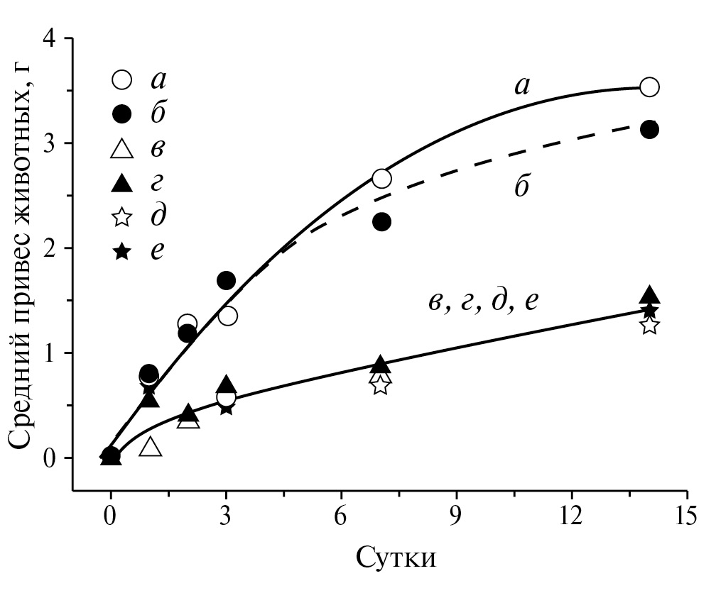 Изменение массы тела экспериментальных животных при накожном нанесении 0.5 г гелей в день в течении пяти дней на выстриженный участок кожи размером 2 см2 на спине мышей приведено на рис. 3. Видно, что при накожном введении необлученных (кривая 1) и облученных дозой 300 кГр гелей (кривая 2) наблюдается повышение средней массы тела подопытных животных, как и в случае контрольной группы мышей без нанесения геля на их кожу [11]. Однако после нанесения на кожу животных гелей содержащих УНТ (рис. 3, кривая в) или фуллерен (рис. 3, кривая д), наблюдается некоторое снижение среднего прироста массы животных. В результате, животные с нанесенными на спину гелями, содержащими наночастицы, в течение 14 суток опыта прибавили в весе всего лишь на 1 г, в тот же промежуток времени, у мышей с нанесенными на спину гелями без наночастиц привес в средней массе составил 3 г.