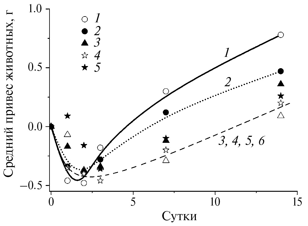 Кроме того, предварительное γ-облучение приводит к тому, что масса тела животных быстрее восстанавливается в ходе эксперимента в случае введения облученного КБМ, чем необлученного. Следует отметить, что в условиях эксперимента у животных, получавших внутрибрюшинным путем дистиллированную воду без КБМ, наблюдается линейное со временем прибавление в весе с первого дня наблюдения (рис. 1, кривая 1). Таким образом, внутрибрюшинное введение как облученного КБМ, так и необлученного негативно сказывается на прибавление веса подопытными животными, и предварительное γ-облучение КБМ снижает неблагоприятное влияние на набор веса животными.