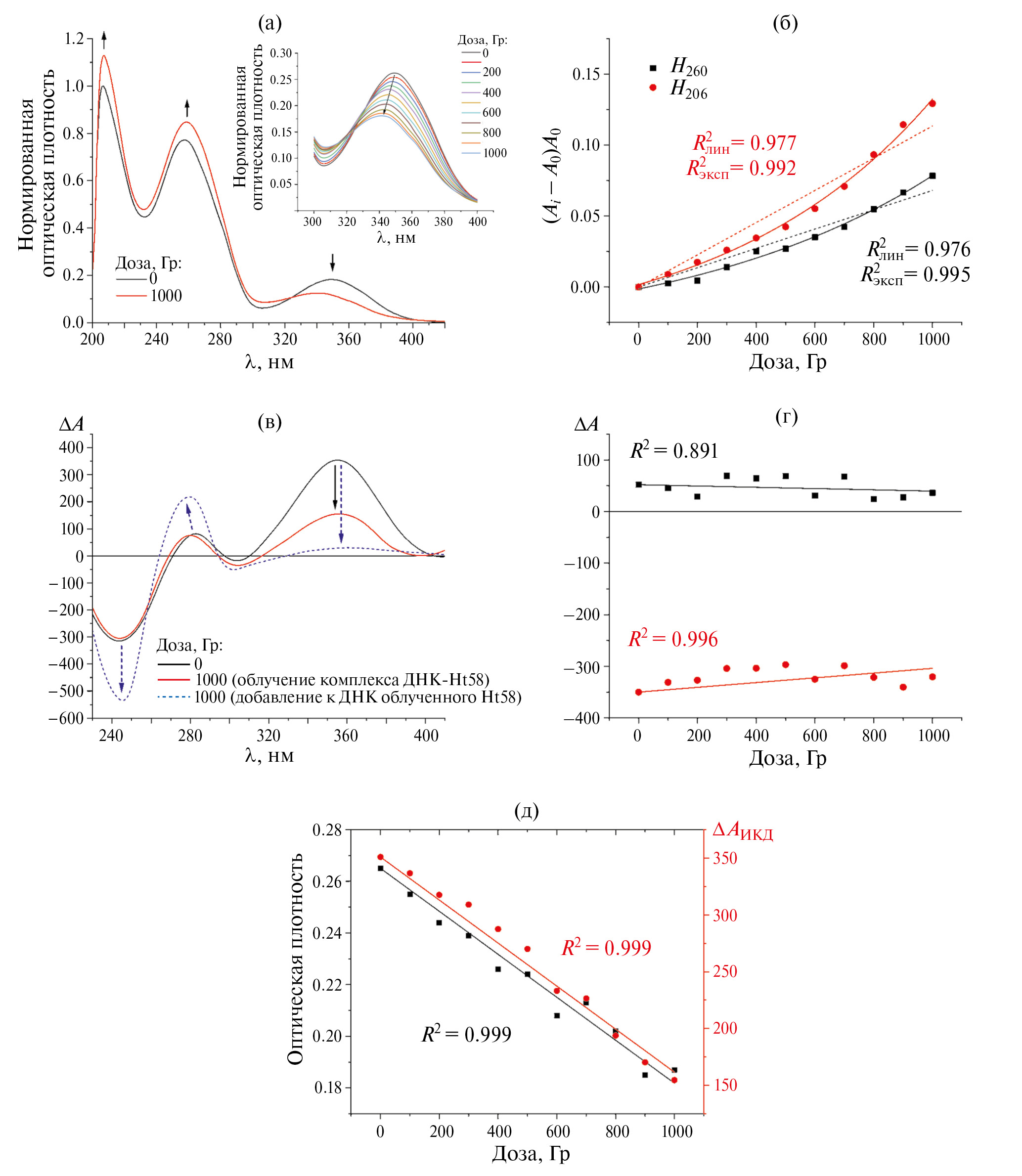 Рис. 2. (а) Нормированные спектры поглощения водно-солевого раствора комплекса ДНК-Ht58 до (черный) и после облучения в дозе 1000 Гр (красный). Нормирование выполнено на величину оптической плотности на длине волны 206 нм в необлученном образце. (б) Зависимости величины Hλ на длинах волн 260 нм (черный) и 206 нм (красный) от поглощенной дозы. Пунктир – фитинг по линейной модели, сплошные кривые – по экспоненциальной модели. (в) Спектры КД нативного раствора комплекса ДНК-Ht58 (черный) и облученного в дозе 1000 Гр (красный). Синим пунктиром обозначен КД-спектр комплекса ДНК с предварительно облученным в дозе 1000 Гр красителем. (г) Дозовые зависимости амплитуд положительного (черный) и отрицательного (красный) КД-сигналов ДНК. (д) Зависимости пиковой оптической плотности в области поглощения Ht58 (черный) и амплитуды полосы индуцированного КД (красный) от дозы.