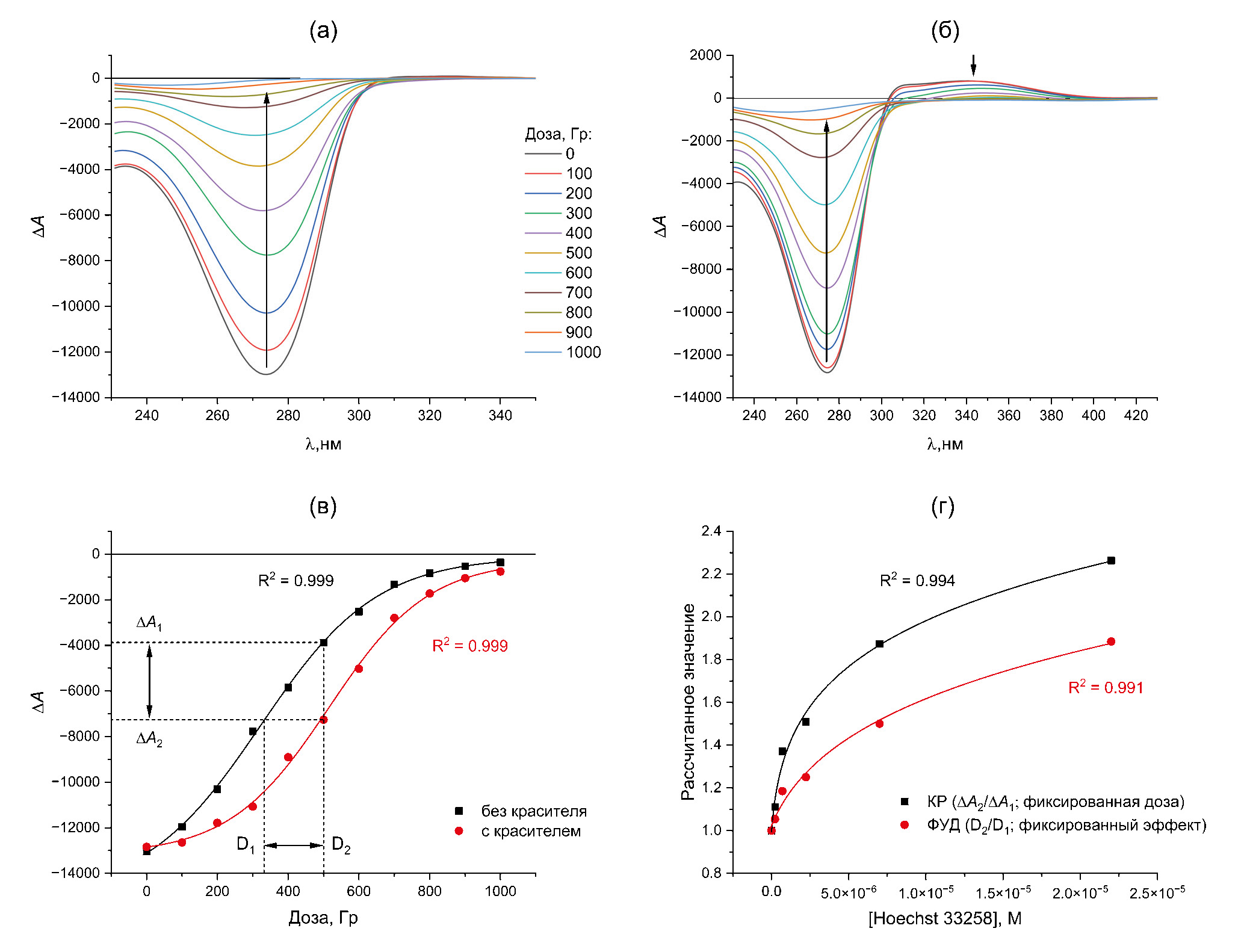 На рис. 1а показаны изменения спектра поглощения водно-солевого раствора ДНК, вызванные воздействием на него рентгеновского излучения в дозе 1000 Гр. Видно, что в исследуемых условиях облучение приводит к увеличению оптической плотности (до ≈10% в области 260 нм и до ≈27% в области 206 нм) – так называемому радиационно-индуцированному гиперхромизму. Зависимости величины гиперхромного эффекта Hλ на длинах волн 260 и 206 нм от дозы, рассчитанные по формуле (1):