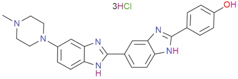 В этой связи интересной задачей представляется поиск подходов, позволяющих с помощью простых физико-химических методов, например методов оптической спектроскопии, проводить как первоначальный скрининг (или, другими словами, экспресс-оценку) потенциальных ДНК-специфичных радиопротекторов, так и более детально изучать механизмы их защитного действия. В настоящей работе мы изучили возможность использования для этого способности молекул ДНК низкой молекулярной массы образовывать в результате фазового исключения в присутствии нейтрального полимера оптически активные холестерические жидкокристаллические дисперсии (ХЖКД; среди прочего они интересны как с позиции детектирования и дозиметрии ИИ [22, 23], так и для изучения поведения лигандов в условиях близких к “биологическим” [24]). В качестве тестового соединения был выбран широко известный краситель Hoechst 33258 (Ht58; схема 1), взаимодействующий с ДНК по модели связывания в малой бороздке, активно используемый в клеточной биологии (о его приложениях см. подробно в работе [25]) и также обладающий выраженными радиопротекторными свойствами [26–28].