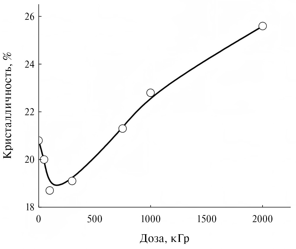 Анализ рентгенограмм облученных образцов ЭТФЭ показал, что облучение дозой до 2000 кГр не вносит существенные изменения в параметры кристаллической структуры сополимера, что свидетельствует о стойкости кристаллической структуры сополимера к радиации. Однако обнаружено снижение интенсивности рефлекса (110) при дохах облучения до 100 кГр (рис. 4), что свидетельствует об уменьшении степени кристалличности сополимера. Вместе с тем, дальнейшее повышение поглощенной дозы до 2000 кГр приводит к росту интенсивности кристаллического рефлекса. Результаты расчетов зависимости степени кристалличности ЭТФЭ от дозы облучения приведены на рис. 5. Видно, что степень кристалличности ЭФТЭ уменьшается от 20.8 до 18.7% при облучении до 100 кГр, а затем с увеличением дозы облучения степень кристалличности растет и достигает 25.6% при дозе облучения 2000 кГр.