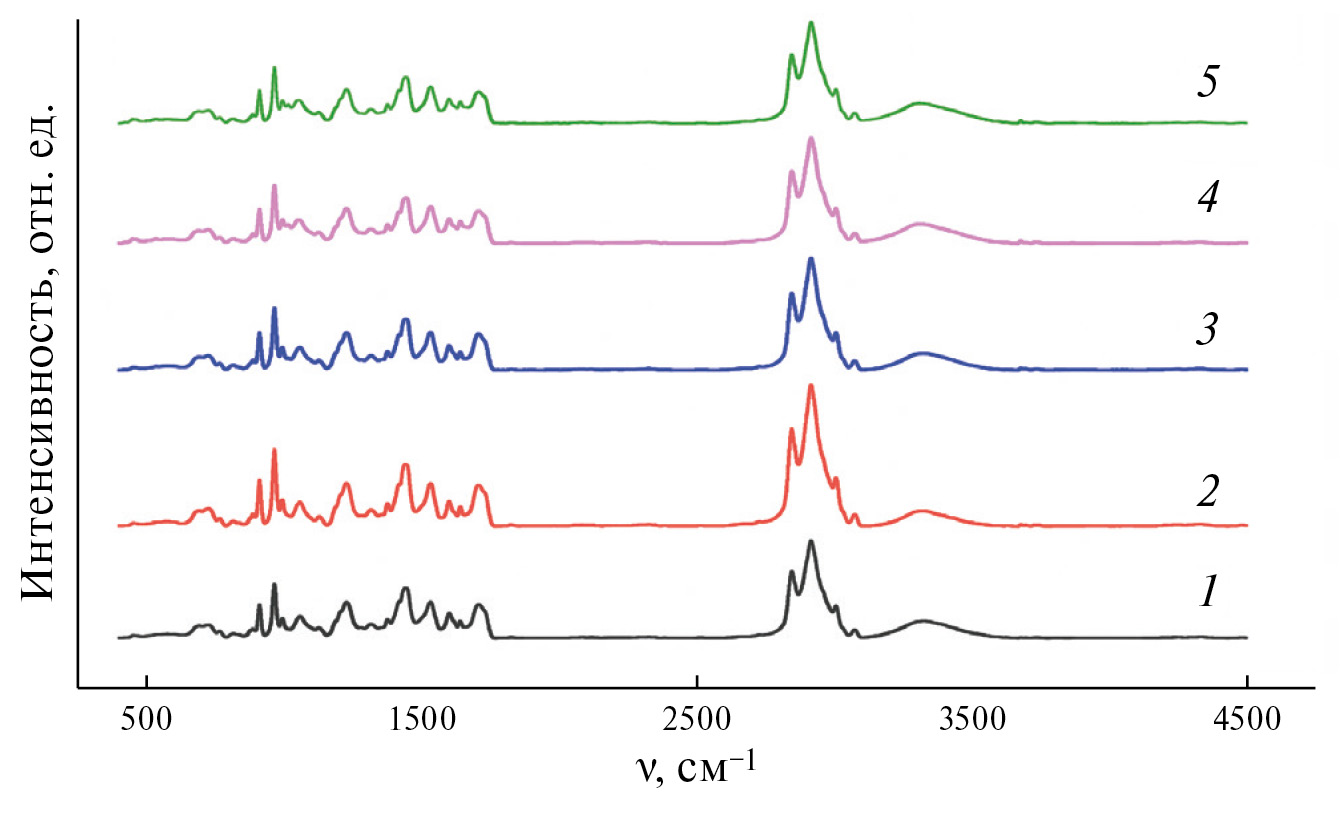 Рис. 1. Спектры ИК-НПВО необлученного ПКМ (1) и образцов ПКМ, облученных дозой (кГр): 50 (2), 100 (3), 150 (4), 200 (5).