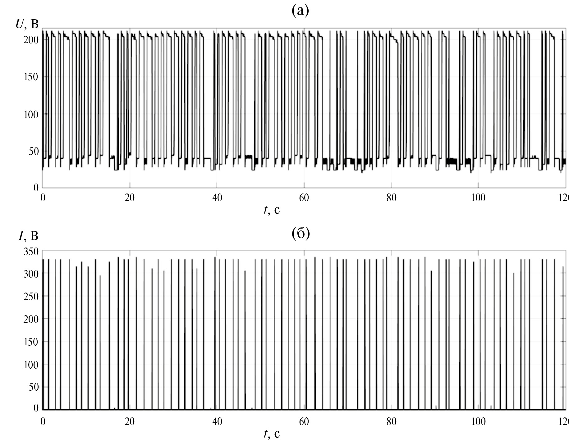 Рис. 2. Осциллограммы напряжения (а) и тока (б) электрических разрядов при напряжении источника постоянного тока 100 В.