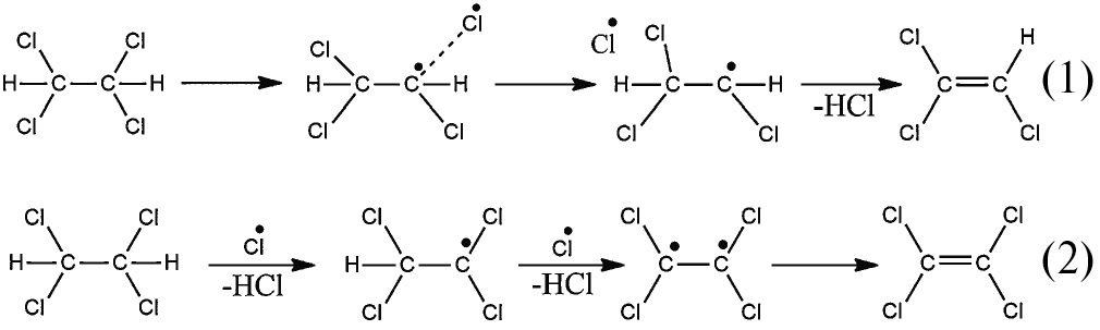 Квантово-химический анализ показывает, что трансформация ТХЭ в трихлорэтилен и тетрахлорэтилен протекает по сопряженным каналам [23]. При полном отрыве атома хлора и последующем внутримолекулярном дегидрохлорировании образуется трихлорэтилен (реакция (1)). Образование тетрахлорэтилена из ТХЭ (реакция (2)) происходит при дегидрохлорировании ТХЭ в процессе двухкратного межмолекулярного отщепления водорода с элиминированием хлористого водорода [23].