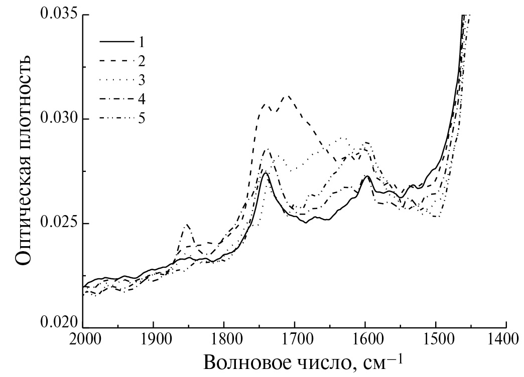 Плазмохимическая обработка приводит к изменению состава и структуры поверхностного слоя. Анализ образцов методом ИК спектроскопии НПВО показал, что наиболее значительные изменения в спектрах наблюдаются в области 1780–1550 см-1 (рис. 1). Рост поглощения в этой области спектра может быть связан с образованием связей С=О в различном окружении, двойных связей С=С. В зависимости от способа обработки пленок изменения в спектрах наблюдаются в разных участках выделенного диапазона, что позволяет предположить, что вид функциональных групп, образующихся при действии разных типов разряда, различен.