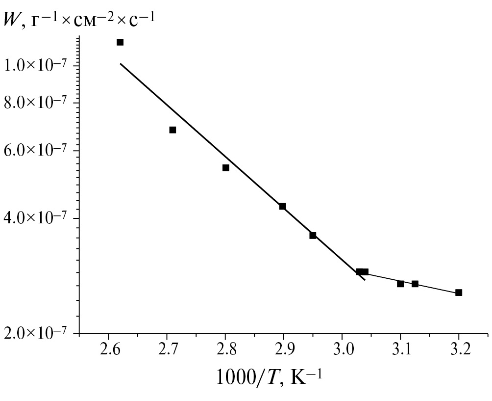 Экспериментальные значения скоростей травления, полученные для плазмы кислорода при разных температурах образца, не описываются единой аррениусовой зависимостью во всем интервале температур (рис. 2). Можно выделить два участка температур: 313–329 К и 330–382 К, в пределах которых экспериментальные точки можно описать линейной зависимостью в аррениусовых координатах с разной эффективной энергией активации процесса плазмоокислительной деструкции полимера. Для первого участка это значение составляет ~2.7 кДж/моль, для второго ~11.2 кДж/моль, что значительно ниже величин, полученных для других полимеров при их обработке в плазме кислорода в аналогичном реакторе при сопоставимых параметрах разряда и в близком температурном интервале: ПЭ – 16, ПП – 21, ПЭТФ 16, ПИ – 22 кДж/моль [11]. Наличие двух участков на температурной зависимости скорости травления пленки ПВДФ может быть связано с структурными перестройками в полимере, приводящими к изменению сегментальной подвижности макроцепей. Отметим, что второй температурный интервал (57–110°С) соответствует температурам, при которых проводится поляризация пленок ПВДФ в сильных электрических полях.
