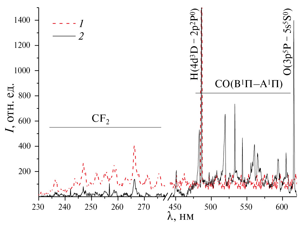 В обоих случаях в спектрах излучения не обнаружено линий фтора (685.6 и 703.7 нм), что может быть связано как с высокой прочностью связи C–F (450 кДж/моль по сравнению с C–H 400 кДж/моль), так и с высоким потенциалом возбуждения атомов фтора (14.75 эВ) что не позволяет зарегистрировать излучение возбужденных атомов фтора.