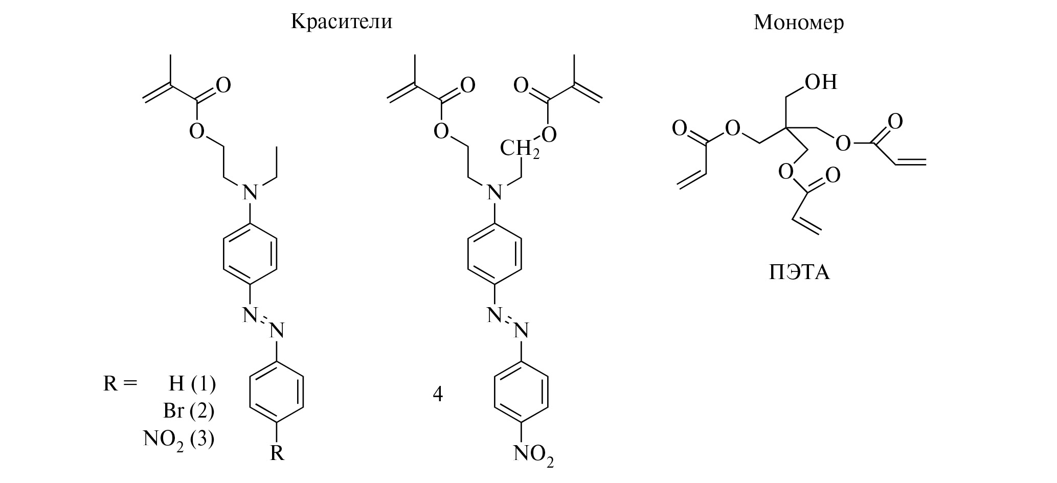 (E)-2-(этил(4-(фенилдиазенил)фенил)амино)этил метакрилат (1), (E)-2-((4-((4-бромофенил)диазенил)фенил)(этил)амино)этил метакрилат (2) и (E)-((4-((4-нитрофенил)диазенил)фенил)азандиил)бис(этан-2,1-диил) бис(2-метакрилат) (4) получены по методикам, описанным в [21−23]. (E)-2-(этил(4-((4-нитрофенил)диазенил)фенил)амино)этил метакрилат (3) – disperse Red 1 methacrylate (Aldrich). Пентаэритритол триакрилат (ПЭТА) (Aldrich) использовали без дополнительной очистки. Растворители очищали по стандартной методике [24].