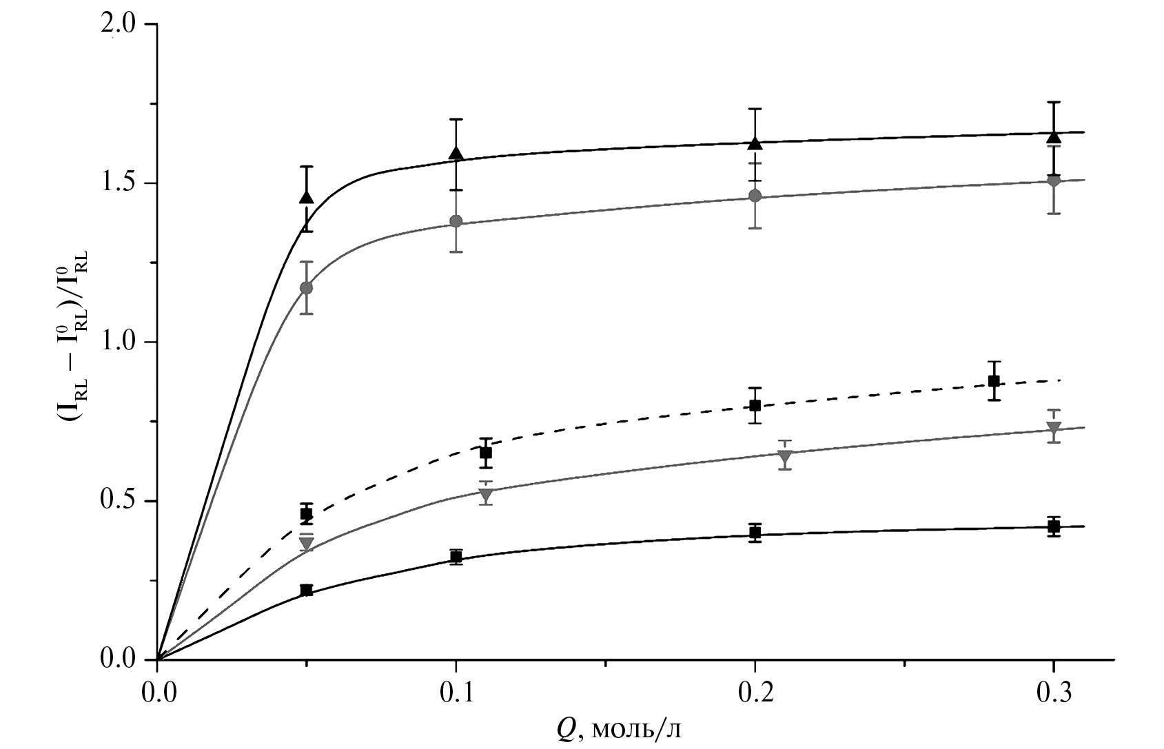 Отсутствие влияния акцепторов на выход ФЛ позволяет полагать, что их активирующее действие на выход РЛ (увеличение интенсивности в максимумах полос и интегральной интенсивности свечения в присутствии акцепторов, см. рис. 2, 3) связано с подавлением акцепторами радикальных продуктов радиолиза воды реакций специфического тушения, возбужденного акваиона тербия. Как видно из рисунков, такое действие характерно для всех изученных акцепторов.