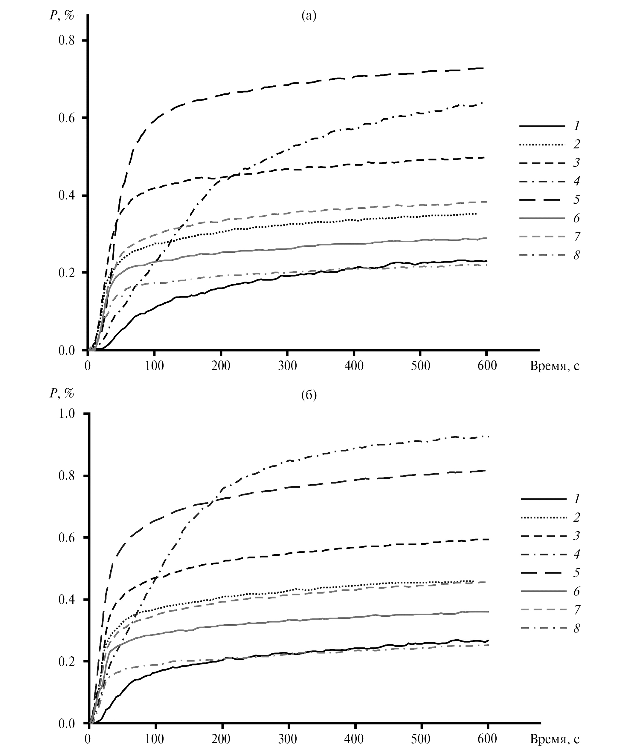 Рис. 3. Кинетические кривые фотополимеризации (мет)акрилатов: 1 – ТМРТМА, 2 – РЕТА, 3 – ТМРТА, 4 – ТМРТА ЕТ, 5 – GPTA, 6 – РЕТТА, 7 – DiMPTA, 8 – DiPEPTA. λ = 385 и 405 нм, мощность облучения 4.8 (а) и 33.6 (б) мВт/см2, [1] = 4 мМ, воздух.