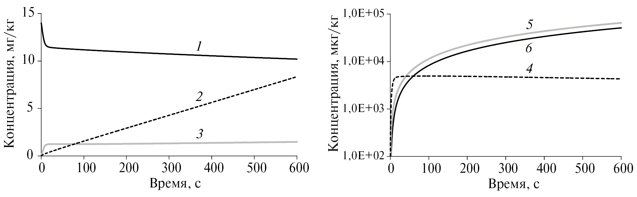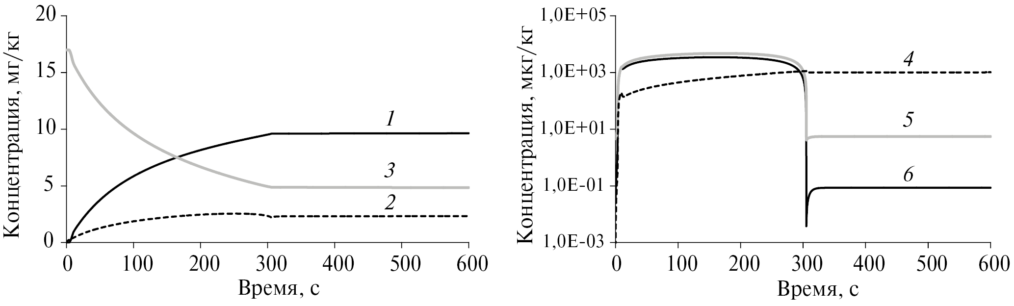 При проведении расчетов значение энергии излучения АЗ относили ко всему объему теплоносителя первого контура. Адекватность такой “точечной” модели обусловлена быстрой циркуляцией теплоносителя через АЗ, объем которой составляет около 4% полного объема контура. Средняя мощность поглощенной теплоносителем дозы составила при этом 190 Гр/с. Первичные выходы продуктов радиолиза воды, указанные в табл. 1, пересчитывались на среднюю температуру теплоносителя θ = 300оС. Принималось, что на протяжении всего рассматриваемого времени высокотемпературный водородный показатель теплоносителя остается постоянным и равным 7.0, а концентрация борной кислоты равна 4 г/кг.