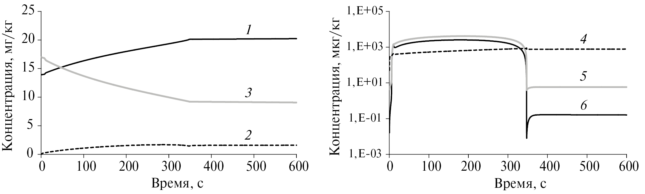 Рис. 4. Концентрация продуктов радиолиза воды и аммиака в теплоносителе ВВЭР, ВХР “N” : 1 – N2; 2 – H2; 3 – NH3; 4 – HNO2; 5 – окислительные продукты; 6 – O2.