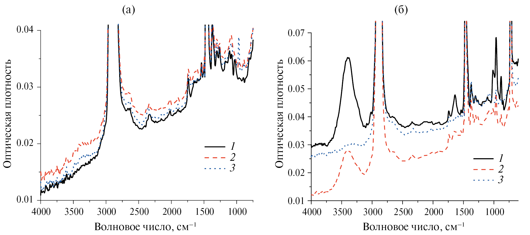 (б) после прививки mDDA; 1 – образец, обработанный в плазме аргона при токе разряда 80 мА, после выдержки в растворе mDDA в течение 1 ч; 2 – этот образец после выдержки в дистиллированной воде (1 ч); 3 – этот образец после “активной” промывки в воде.