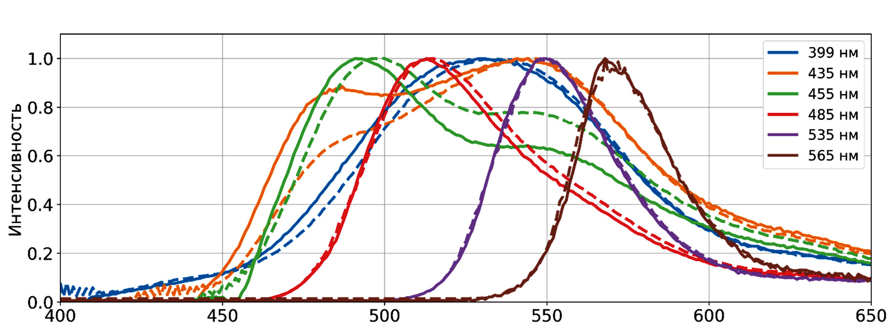 Рис. 5. Спектры люминесценции раствора (сплошные) и кластеров (пунктирные) ККТ InP:Mn/ZnS при различных длинах волн возбуждения.