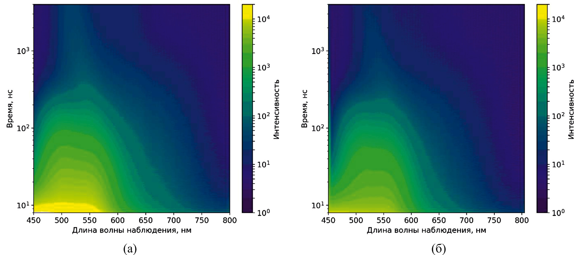 Рис. 6. Матрицы времяразрешенной люминесценции (а) раствора и (б) нанокластеров InP:Mn/ZnS.
