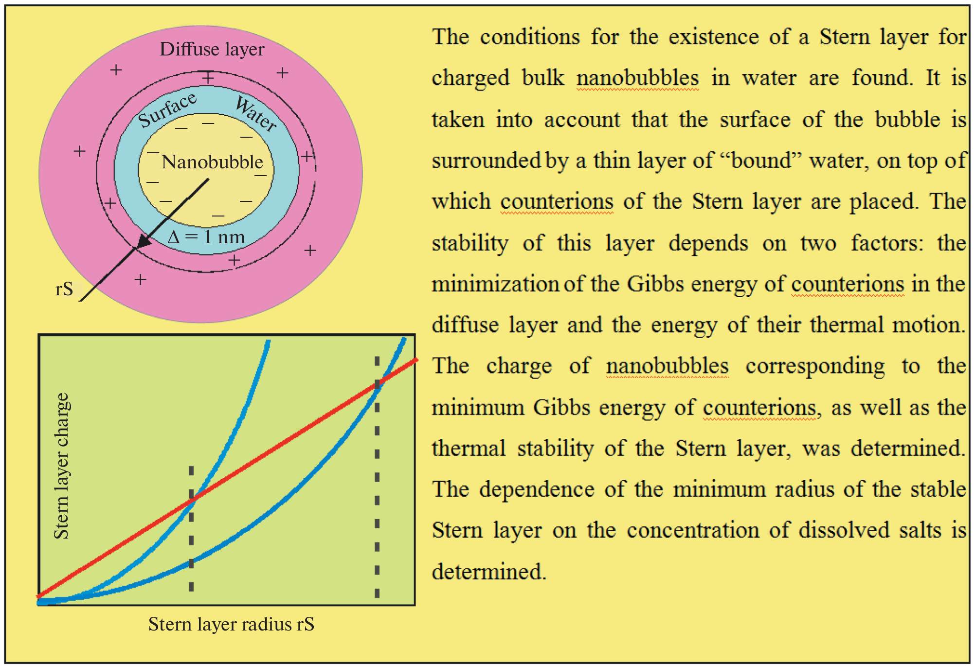 When analyzing the characteristics of the electrical double layer of bulk nanobubbles in water, the conditions for the existence of their Stern layer are found. It is taken into account that the surface of the bubble is surrounded by a thin layer of “bound” water, on top of which the counterions of the Stern layer are placed. The stability of this layer depends on two factors: the minimization of the Gibbs energy of counterions in the diffuse layer and the energy of their thermal motion, which is capable of pulling the counterion out of the Stern layer and returning it to the region of the diffuse layer. The charge of nanobubbles has been determined, which corresponds to both the minimum Gibbs energy of counterions and the thermal stability of the Stern layer. The dependence of the critical radius of the stable Stern layer on the concentration of dissolved salts is determined.