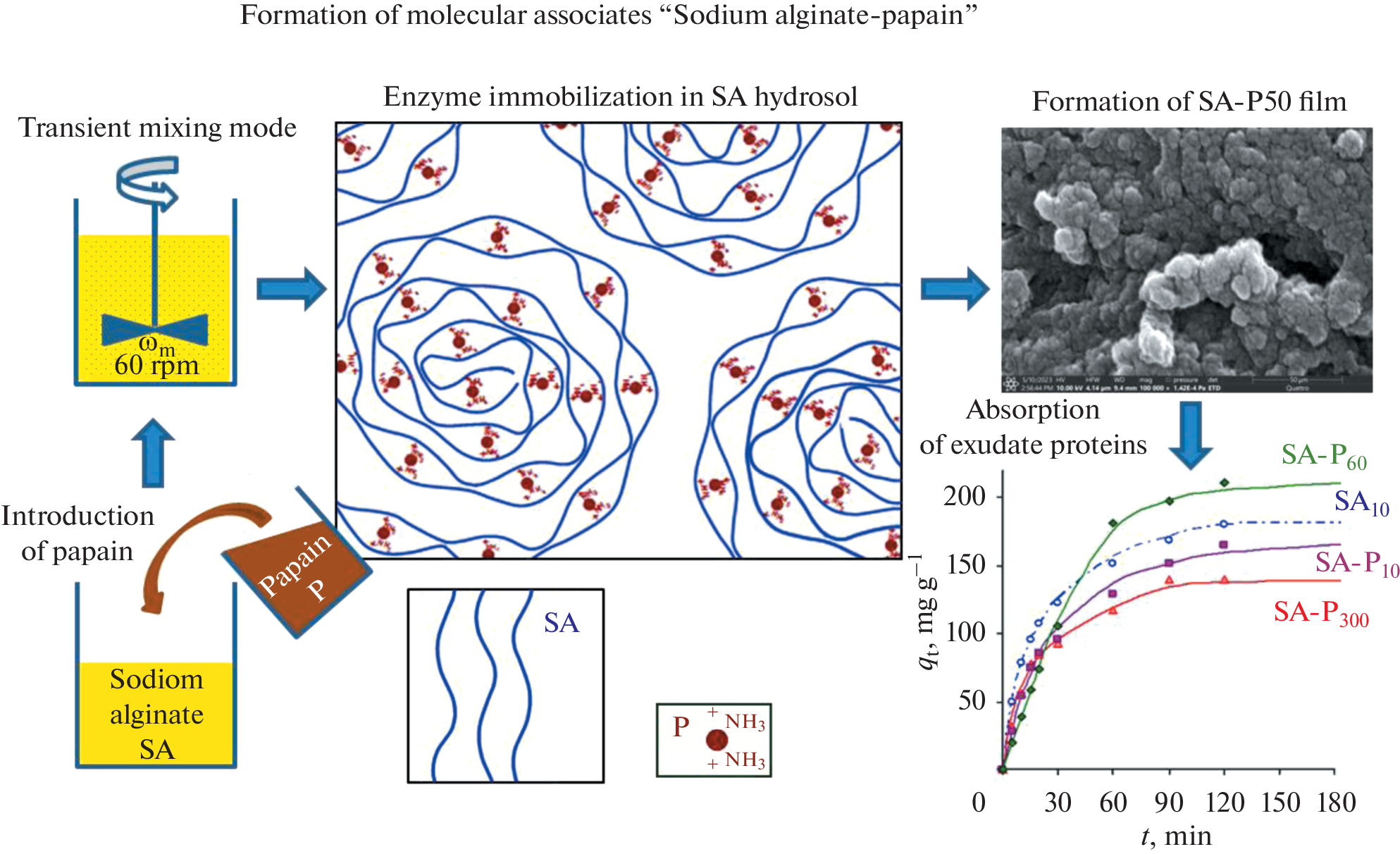 The regularities have been studied for the formation of molecular associates upon the introduction of papain into a sodium alginate colloidal solution in the laminar low-speed, transient, and turbulent stirring regimes. The relationship between variations in the sorption capacity of the biopolymer composition and the kinetic regularities of the interphase transfer has been studied during the sorption binding of albumin, which is one of the protein-based components of wound exudates, with such components being subject to ensimatic cleavage. The state of the dispersed phase of the colloidal solutions has been estimated by the dynamic light scattering method. The properties of the formed biopolymer films have been studied using the methods of scanning electron microscopy, low-temperature nitrogen adsorption, and static albumin sorption from solutions of limited volumes. The data of the sorption experiments have been analyzed using the Boyd, Morris–Weber, and gel diffusion models, as well as the Lagergren pseudo-first-order and Ho–McKay pseudo-second-order kinetic models. The data have been obtained for substantiating the dosages of the biopolymermatrix used on wound-healing bandages and for the efficient binding of wound necrotic contamination during the time preset according to the technical requirements.