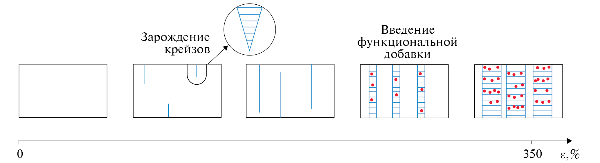 В качестве низкотемпературного способа введения функциональных добавок в работе предлагается использовать структурно-механическую модификацию по механизму крейзинга в адсорбционно-активной среде (ААС), в процессе которой в объеме полимера формируется система ориентированных и разобщенных фибрилл диаметром 5–20 нм [21, 22]. Одновременно с этим происходит захват, диспергирование и фиксация в порах полимерной матрицы вещества, растворенного в ААС [23, 24]. Ранее в работах [25, 26] были изучены особенности крейзинга пленок и волокон ПЛ и получены материалы, содержащие традиционно используемые антисептические препараты бриллиантовый зеленый и йод [27, 28].