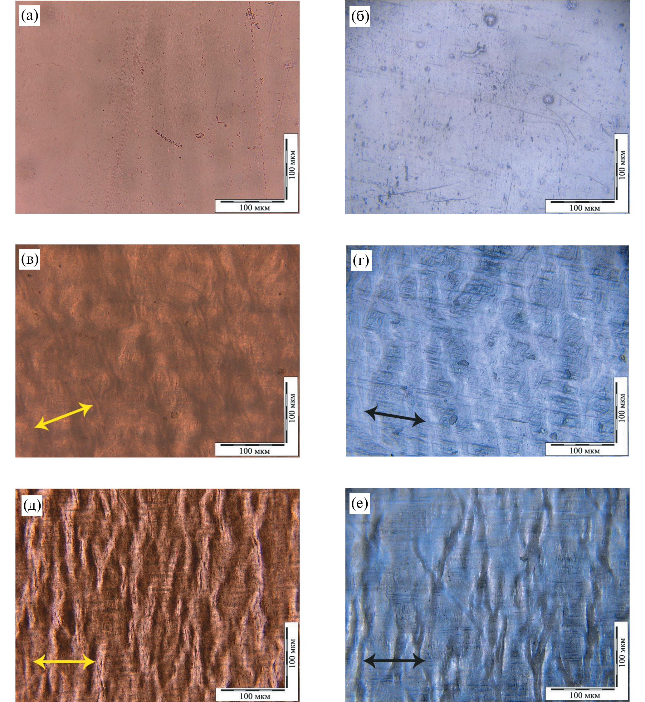 Рис. 2. Микрофотографии образцов исходного ПЛ (а, б), ПЛ после структурной модификации без (в, г) и с импрегнацией CuSO4 (д, е), полученные с помощью оптического микроскопа в проходящем (а, в, д) и отраженном (б, г, е) свете при увеличении 200×. Стрелками указано направление растяжения.