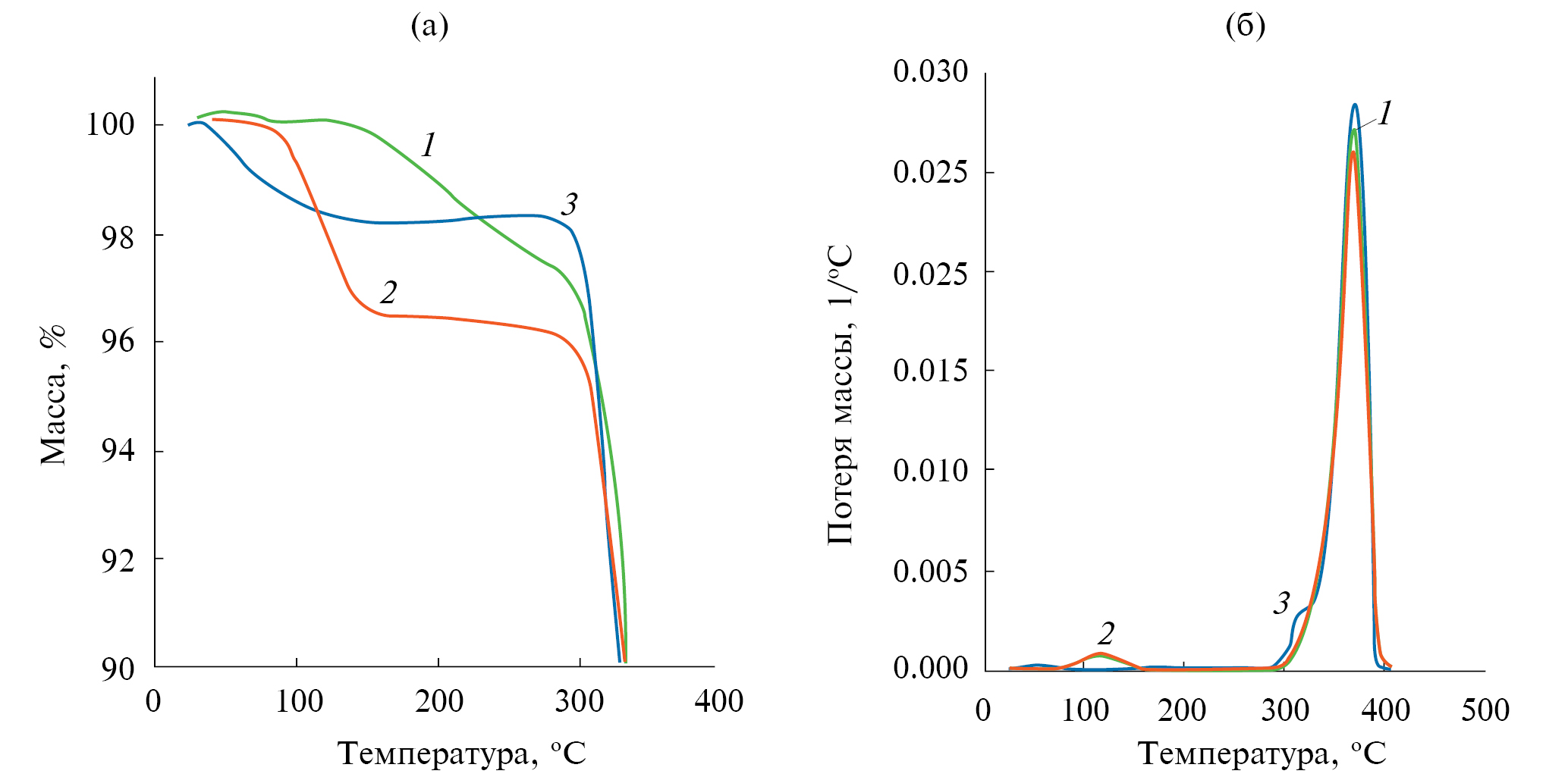 Рис. 4. Термогравиметрические (а) и дифференциальные термогравиметрические (б) кривые образцов: исходного ПЛ (кривая 1), модифицированного ПЛ (кривая 2), модифицированного ПЛ с CuSO4 (кривая 3).