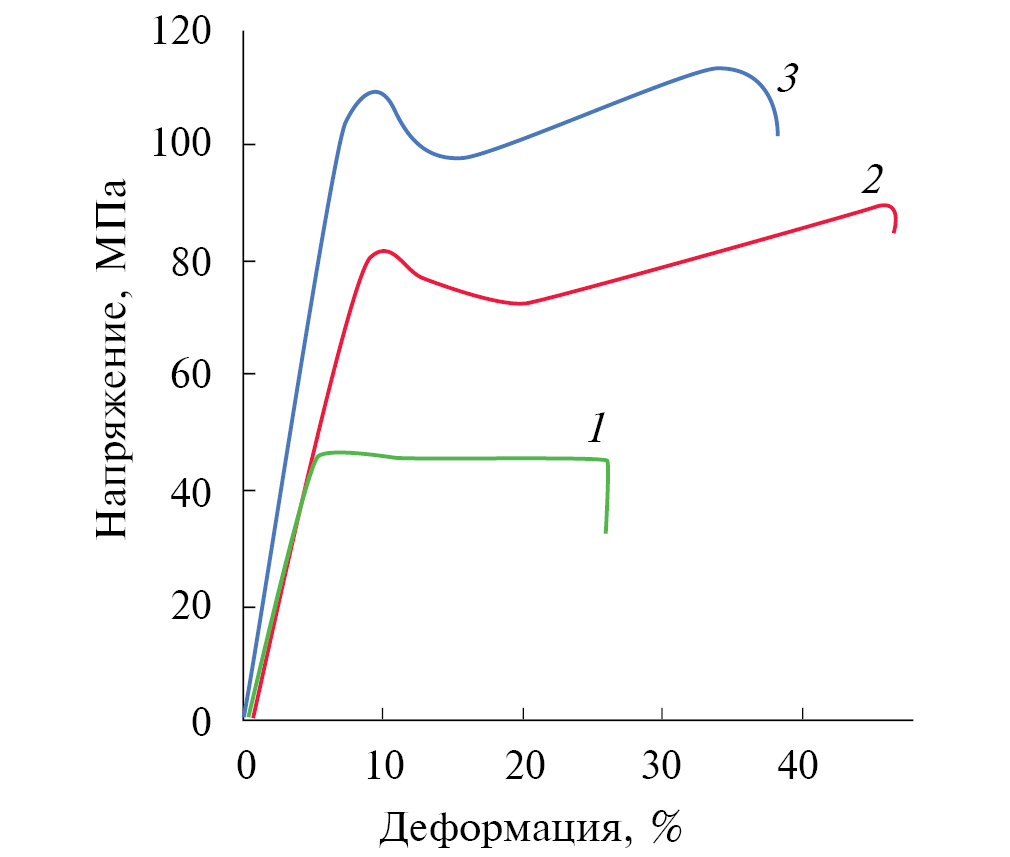 Рис. 6. Деформационные кривые растяжения образцов: исходный ПЛ (кривая 1), модифицированный ПЛ (кривая 2), модифицированный ПЛ с CuSO4 (кривая 3).