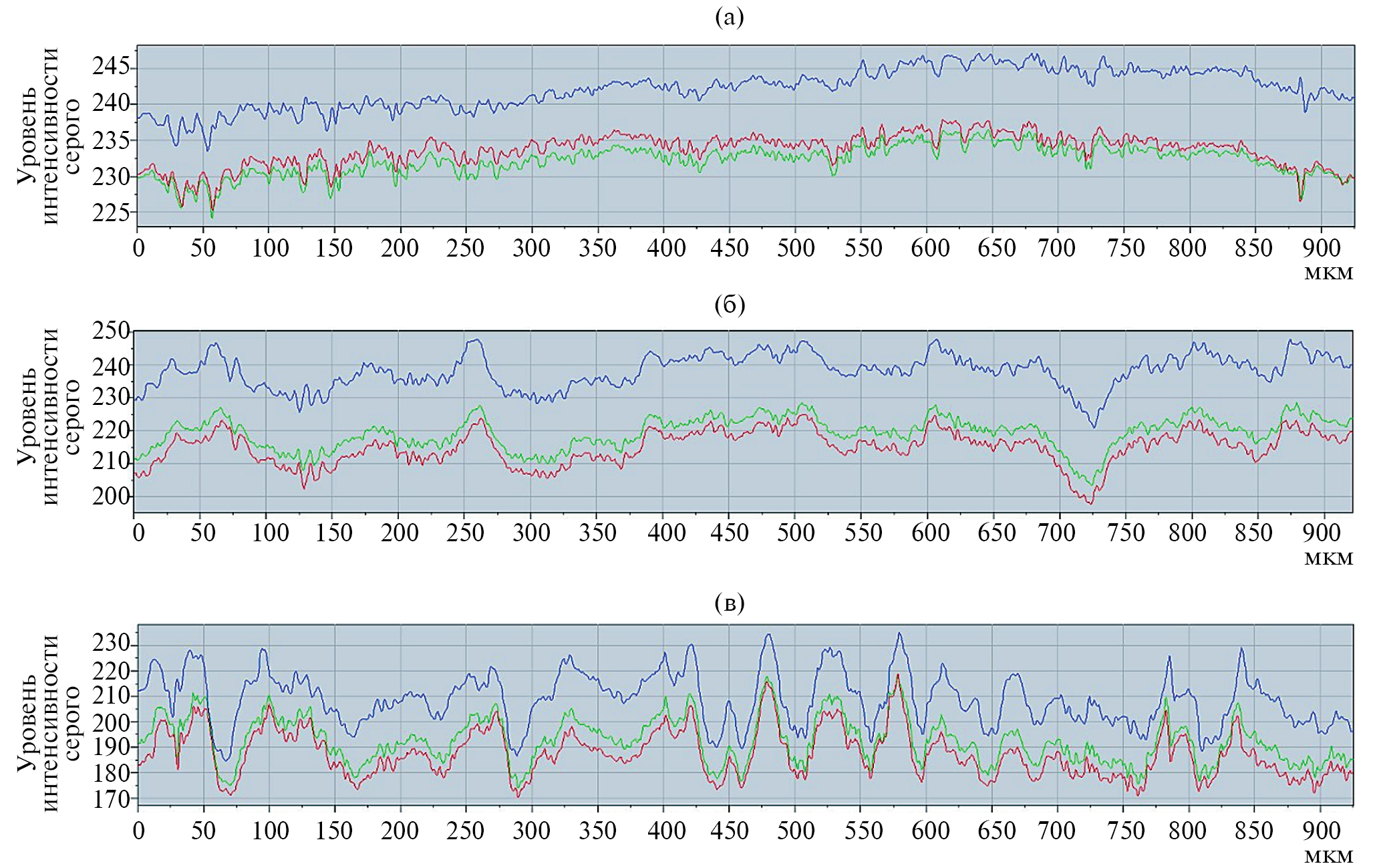 Рис. 7. Линейный профиль, полученный с помощью оптического микроскопа, образцов исходного ПЛ (а), модифицированного ПЛ без (б) и с импрегнацией CuSO4 (в).