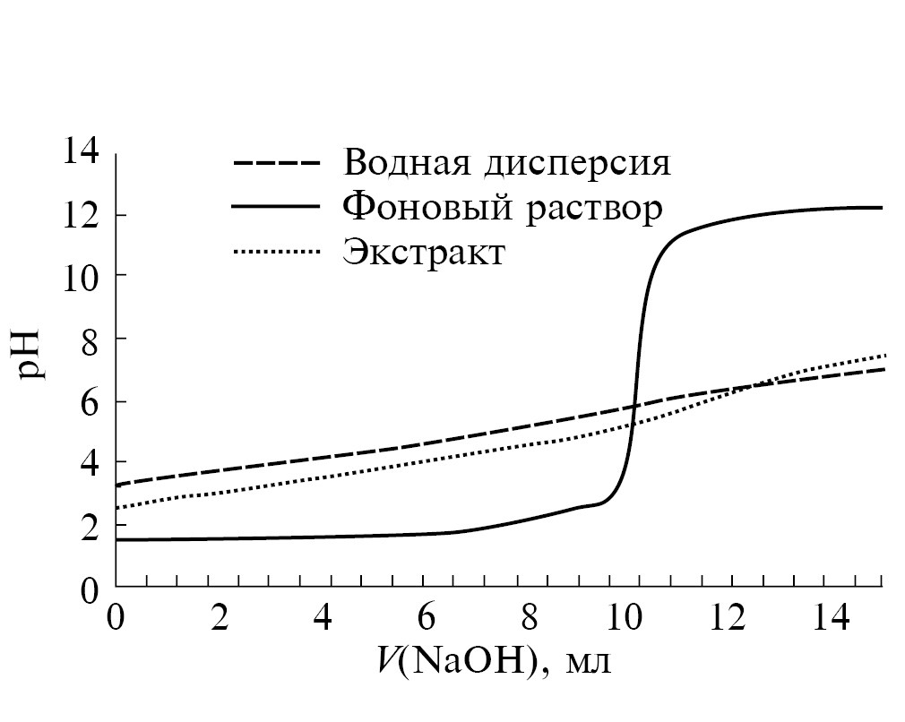 На рис. 3 представлены кривые потенциометрического титрования фонового раствора, экстракта и водной дисперсии плодов софоры японской.