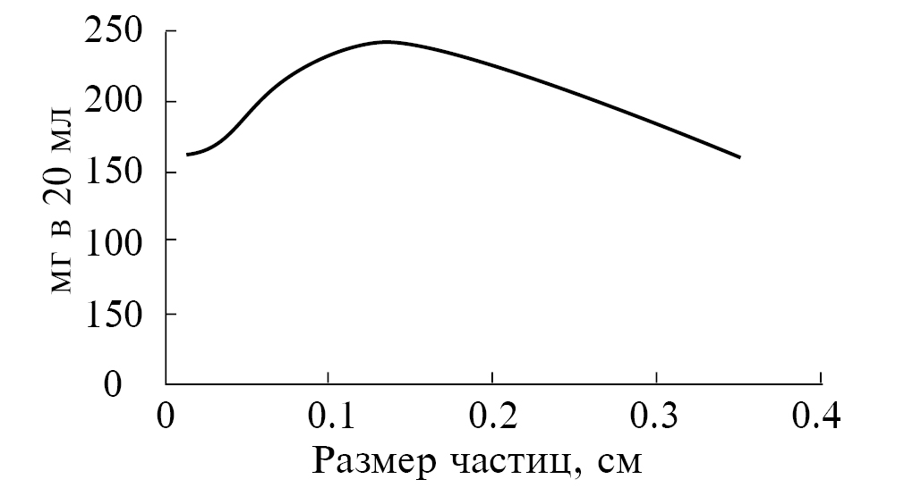 Размер частиц измельченных плодов софоры японской оказывает существенное влияние на набухание и, как следствие, на увеличение диффузии флавоноидов в экстрагент. Отмечено, что при большем измельчении плодов набухание увеличивается, однако при чрезмерном измельчении в экстрагент выходят большое количество балластных веществ, что затрудняет процесс экстракции – диффузия флавоноидов ухудшается. Оптимальный размер частиц для экстракции флавоноидов из плодов софоры японской соответствует 0.1–0.2 см.