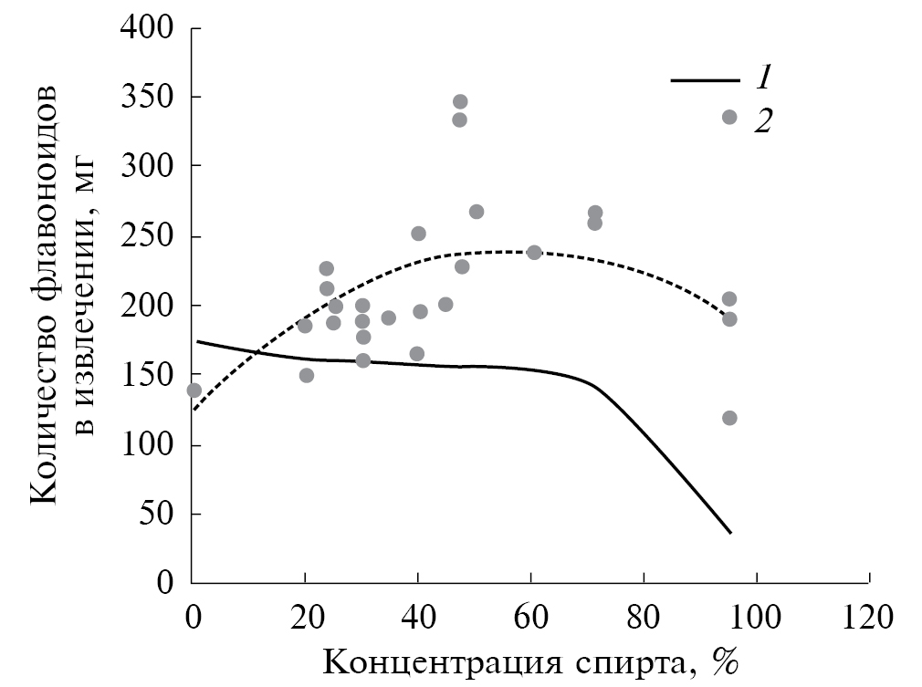 Гликозидные формы флавоноидов лучше растворимы в спирте, чем в воде [26], но понижение степени набухания в спиртовых растворах приводит к уменьшению их экстракции из частиц софоры. Определено оптимальное содержание этилового спирта в экстрагенте – 50%.