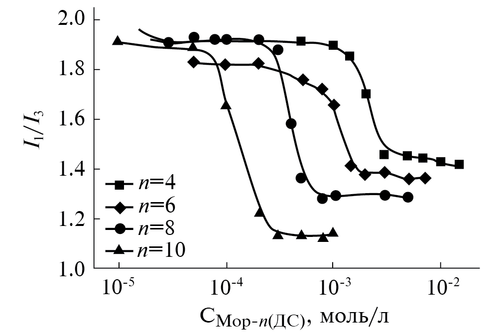 Рис. 2. Зависимость отношения интенсивностей флуоресценции первого (373 нм) и третьего (384 нм) колебательных пиков пирена от концентрации биамфифилов для бинарных систем Мор-n(ДС)/пирен: черный квадрат – Мор-4(ДС), черный ромб – Мор-6(ДС), черный круг – Мор-8(ДС), черный треугольник – Мор-10(ДС); 25°С.