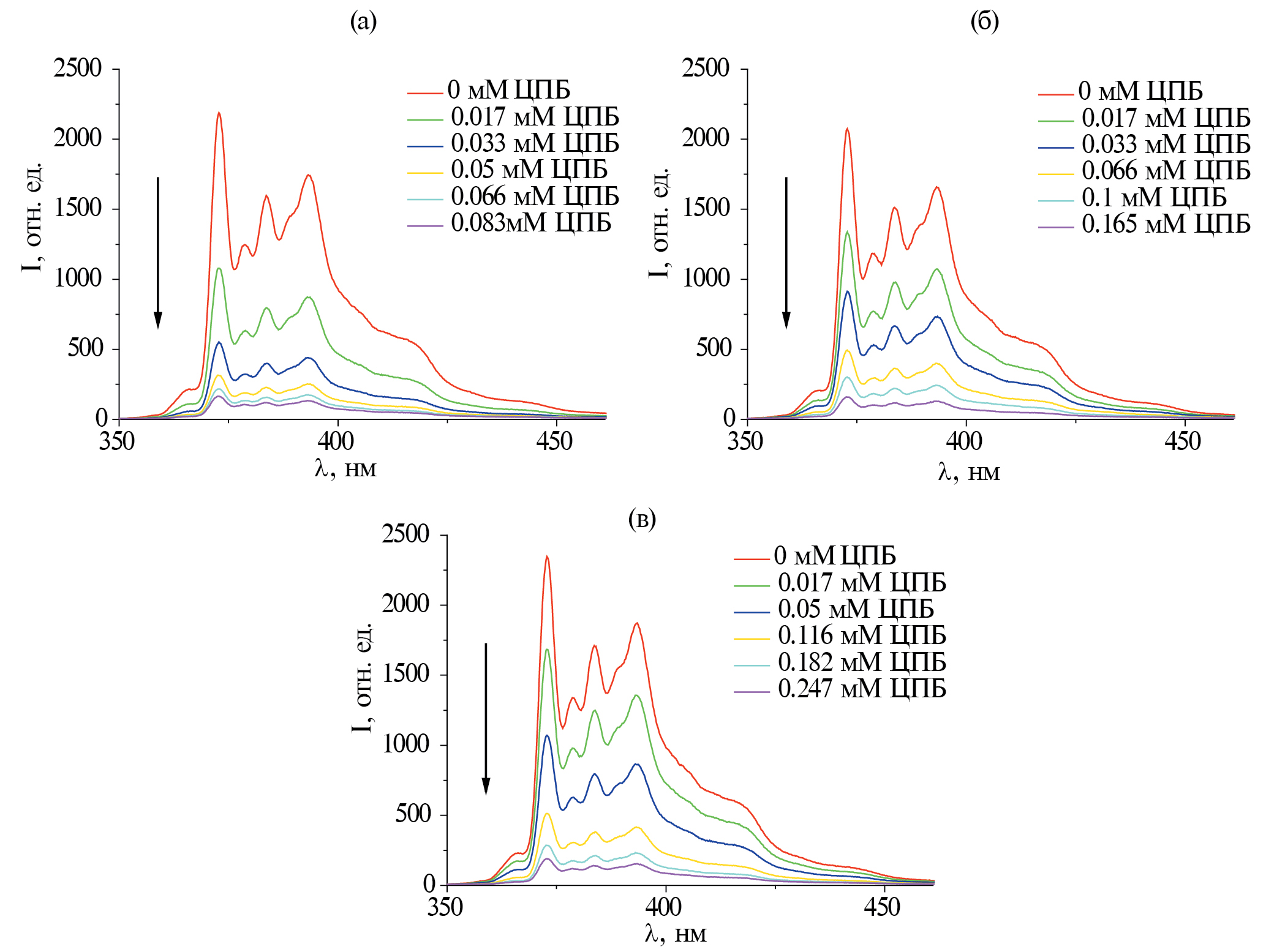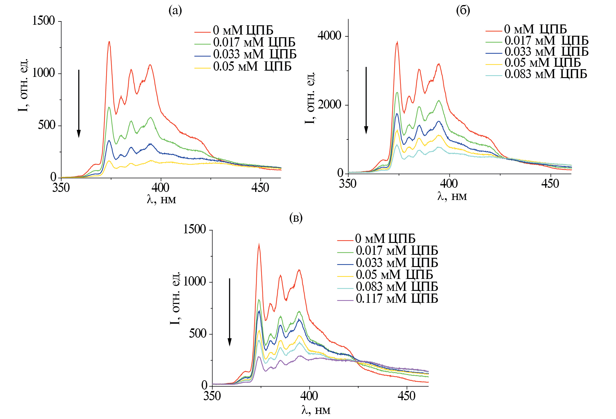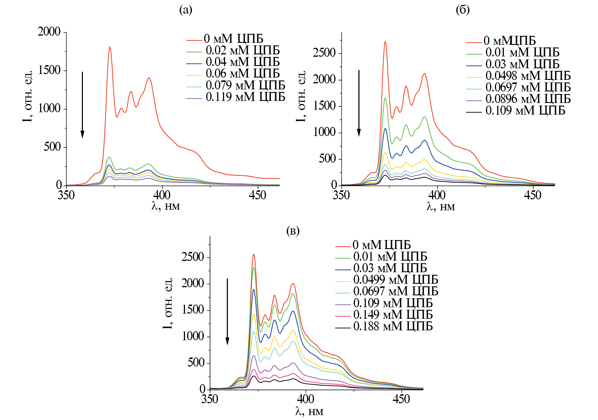 Рис. П20. Спектры флуоресценции пирена в присутствии различных количеств тушителя (ЦПБ) для 1 мМ (а), 3 мМ (б) и 5 мМ (в) Мор-8(ДС); стрелкой показано направление увеличения концентрации тушителя.