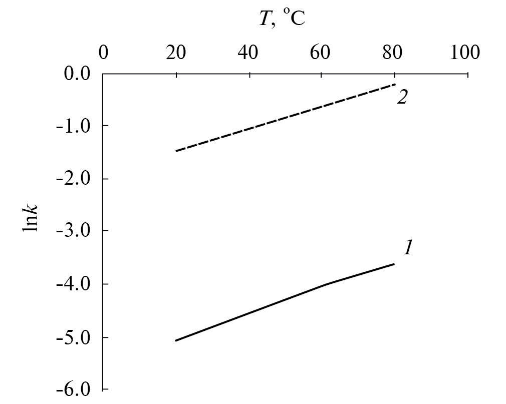 Зависимость логарифма электропроводности от температуры имеет линейный характер в интервале от 20 до 80°C (рис. 2). Роста κ на несколько порядков в узком интервале температуры (температурной перколяции) не происходит, структура МЭ, вероятно, не меняется. Можно полагать, что при Т = 80°C так же, как и при Т = 20°C, в МЭ с Φ = 0.13 (W = 5) структура в основном представлена изолированными каплями, а в МЭ с Φ = 0.30 (W = 15) – преимущественно динамическими кластерами из капель. Наличие перколированной структуры может облегчить перенос вещества между каплями, в том числе и перенос экстрагента и экстрагируемых веществ (катионов металлов) при микроэмульсионном выщелачивании.