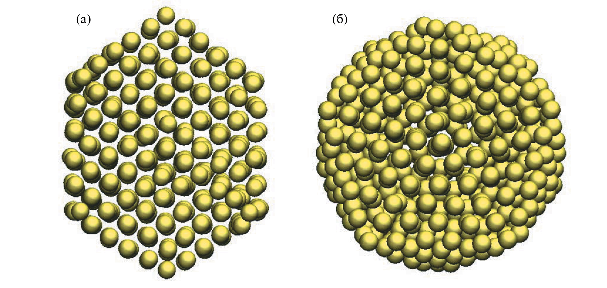 Рис. 1. МД конфигурации, отвечающие трансформации кубооктаэдрического нанокластра Au561 в икосаэдрическую наночастицу: а – 140 пс после начала нагрева (температура 440 К); б – 160 пс после начала нагрева (температура 460 К). Скорость нагрева 1 К/пс.