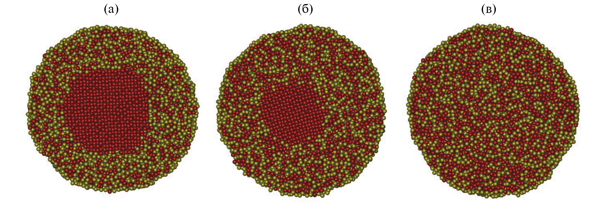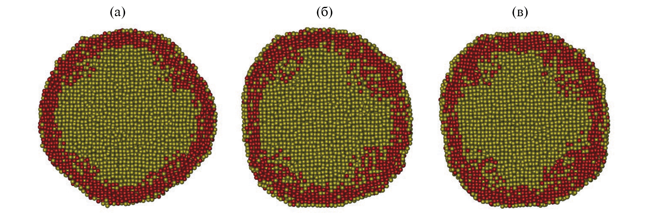 Рис. 2. Эволюция наночастицы Co15000@Au15000 в процессе ее релаксации при 1100 К в течение: а – 10 нс, б – 40 нс, в – 43.2 нс. Атомы Au отмечены желтым цветом, атомы Co – красным.