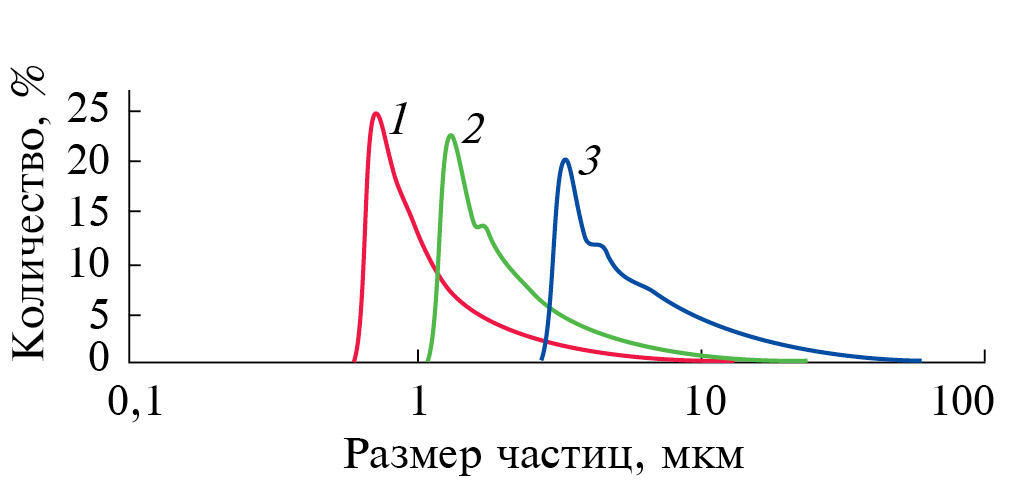 Рис. 2. Результаты измерения линейных размеров образцов МГ методом лазерной дифракции: 1 – целлюлоза, 2 – кора сосновая, 3 – лигнин технический.