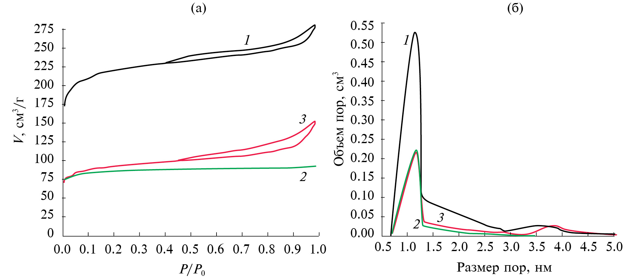 Рис. 3. Результаты исследований поверхностных свойств МГ: a – изотермы низкотемпературной адсорбции-десорбции азота (1 – целлюлоза, 2 – кора сосновая, 3 – лигнин технический); б – распределение пор по размерам (1 – целлюлоза, 2 – кора сосновая, 3 – лигнин технический).