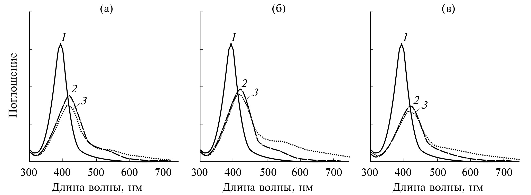 Рис. 2. Оптические спектры поглощения: 1 – исходного гидрозоля, 2 – свежеполученного органозоля и 3 – органозоля после четырех последовательных стадий высушивания и пептизации. СЦТАБ, мМ: а – 7.5; б – 10; в – 12.5.