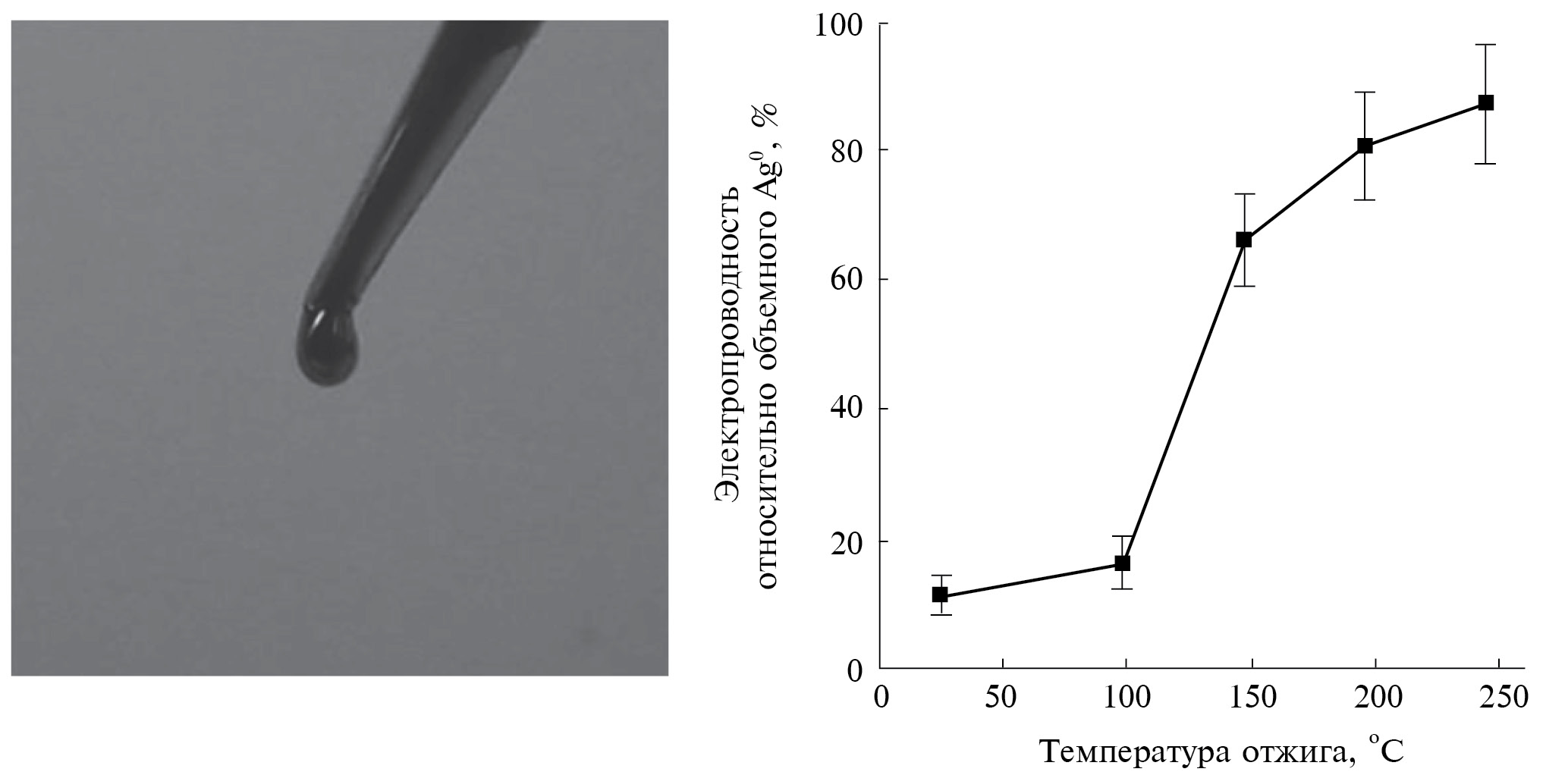 Рис. 7. Внешний вид капли органозоля с концентрацией металла 1800 г/л и зависимость удельной электропроводности относительного объемного серебра полученных пленок от температуры отжига.
