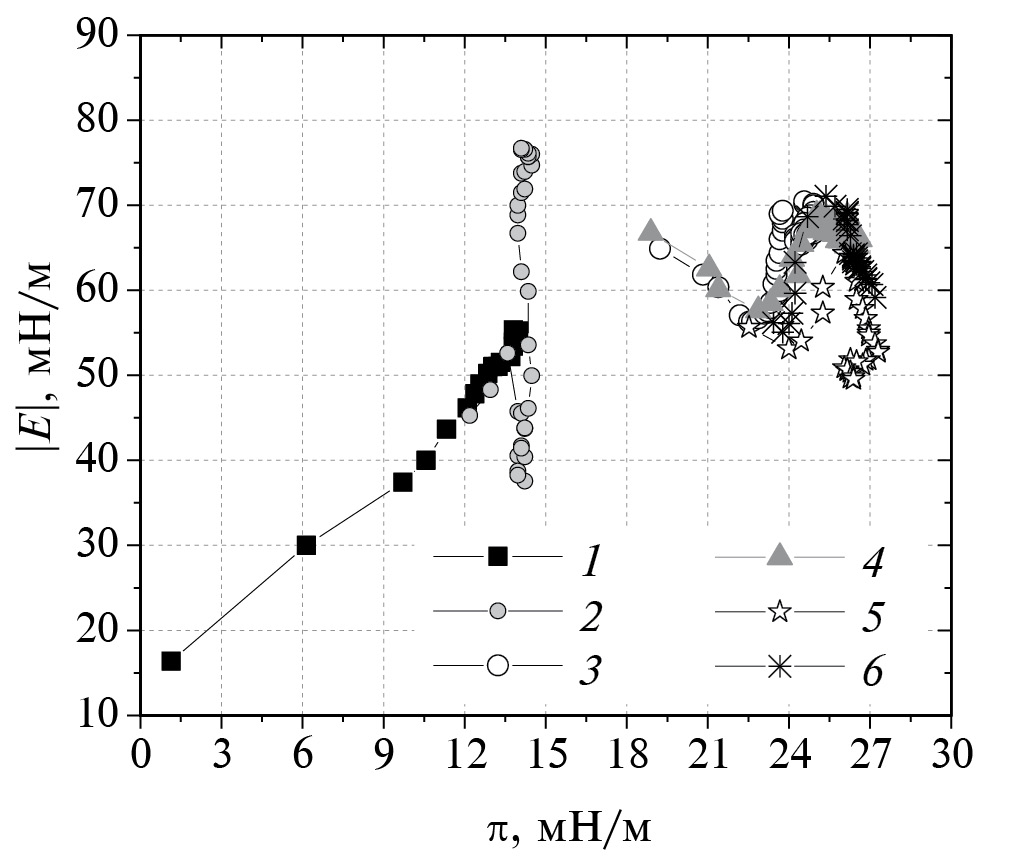 Рис. 2. Зависимости динамической поверхностной упругости от поверхностного давления растворов фибриногена с концентрацией 3 · 10–7 М (1); растворов, содержащих фибриноген с концентрацией 3 · 10–7 М и тромбин концентрацией 300 Ед/л (2); растворов смесей фибриноген-содержащего и тромбин-содержащего компонентов клея “Криофит”, взятых в соотношениях 10 : 1 (3), 5 : 1 (4), 2 : 1 (5), 1 : 1 (6).