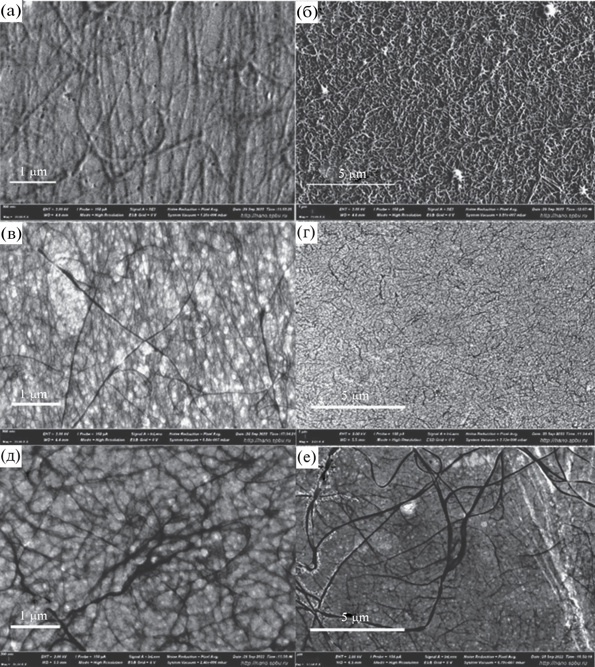Рис. 5. СЭМ-изображения пленок фибрина, полученных из растворов смесей фибриноген-содержащего и тромбин-содержащего компонентов клея “Криофит”, взятых в соотношениях 5 : 1 (а, б), 2 : 1 (в, г), 1 : 1 (д, е).