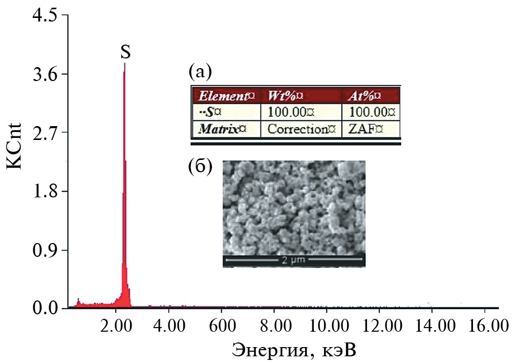 На рис. 4 по данным СЭМ-ЭДС на вкладке (а) для образца серы в увеличенном масштабе заметна неоднородность по размерам и форме частиц. Видно и наличие тонкого слоя налетов поверх крупных частиц. Как и ожидалось, ЭДС анализ (рис. 4) и вкладка (б) показывают только наличие серы, что согласуется с результатами ПЭМ, РФА и КР.