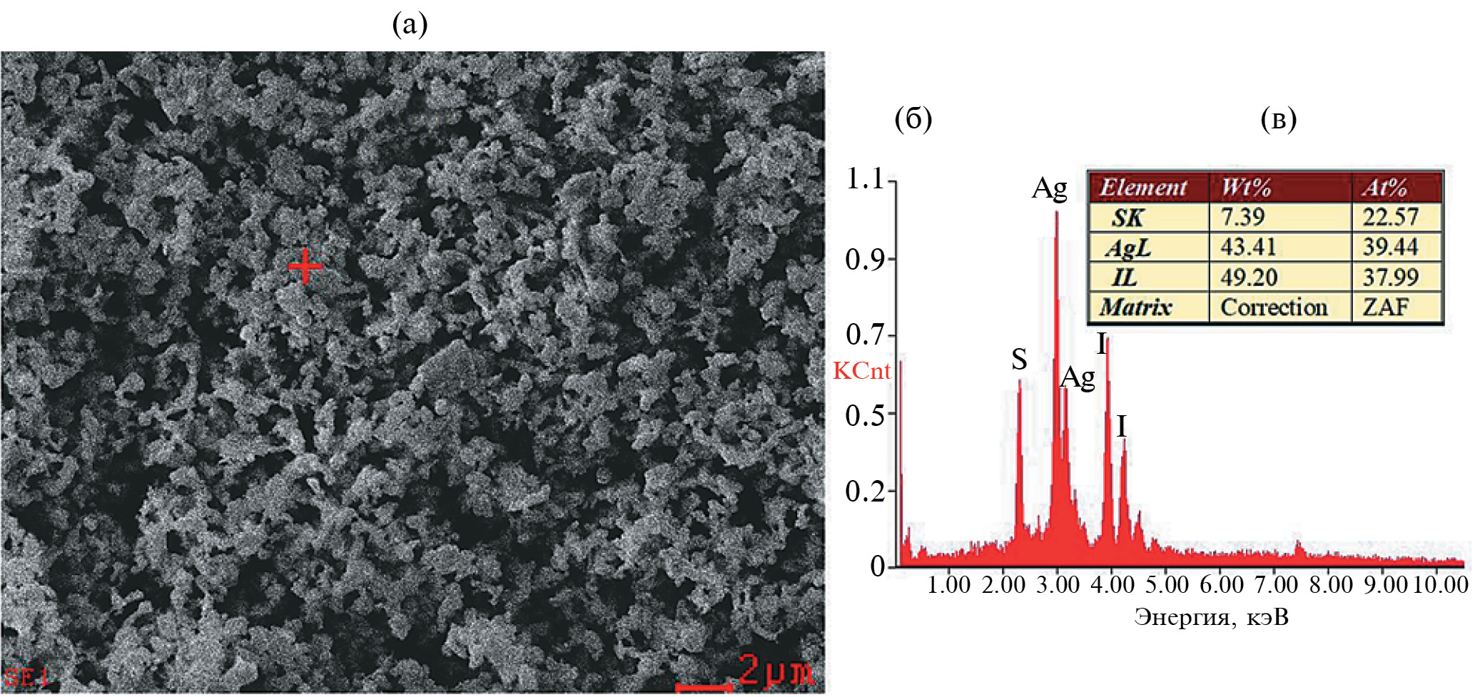 Морфологию, размер и состав частиц S*/AgI определяли также методом СЭМ-ЭДС. СЭМ (рис. 7) показывает, что композит S*/AgI составлен из частиц, характеризующихся разнообразием форм и размеров. Более детальным рассмотрением можно установить, что S*/AgI состоит из агломератов более мелких частиц, и, кроме того, на поверхности крупных частиц обнаруживаются отложения наносеры. Элементный состав образца S*/AgI был установлен ЭДС анализом (рис. 8). Видно, что исследуемый участок (а) образца дает интенсивность линии (б) и атомное содержание серы (в), близкие к таковым для Ag и I, что в некоторой степени подтверждает заявленное содержание наносеры в S*/AgI. Отметим, что элементный состав измерялся в ничтожно малом участке образца и может не отражать его элементный состав в целом. Однако этот результат может свидетельствовать о неоднородности распределения компонентов в композите S*/AgI.