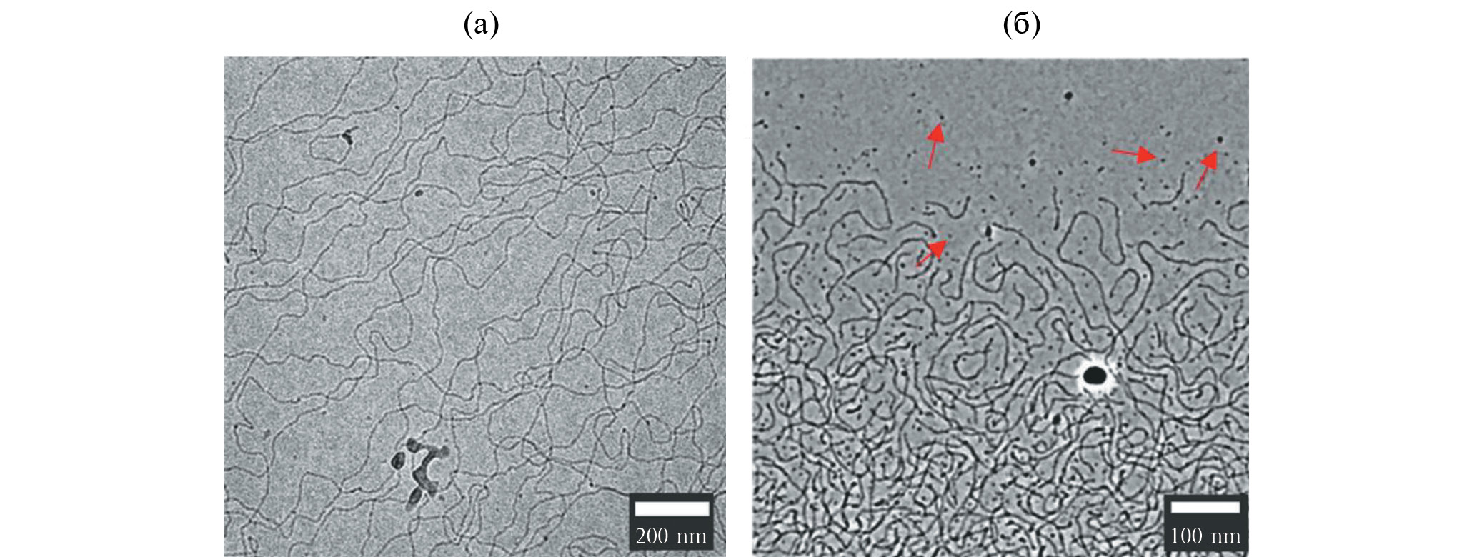 Рис. 4. Изображения, полученные методом криогенной просвечивающей электронной микроскопии для раствора ПАВ при общей концентрации 46 ммоль/л, содержащего цвиттерионное ПАВ ОАПБ и катионное ПАВ ОАПА, при мольной доле катионного ПАВ 0.018 (а) и 0.50 (б).